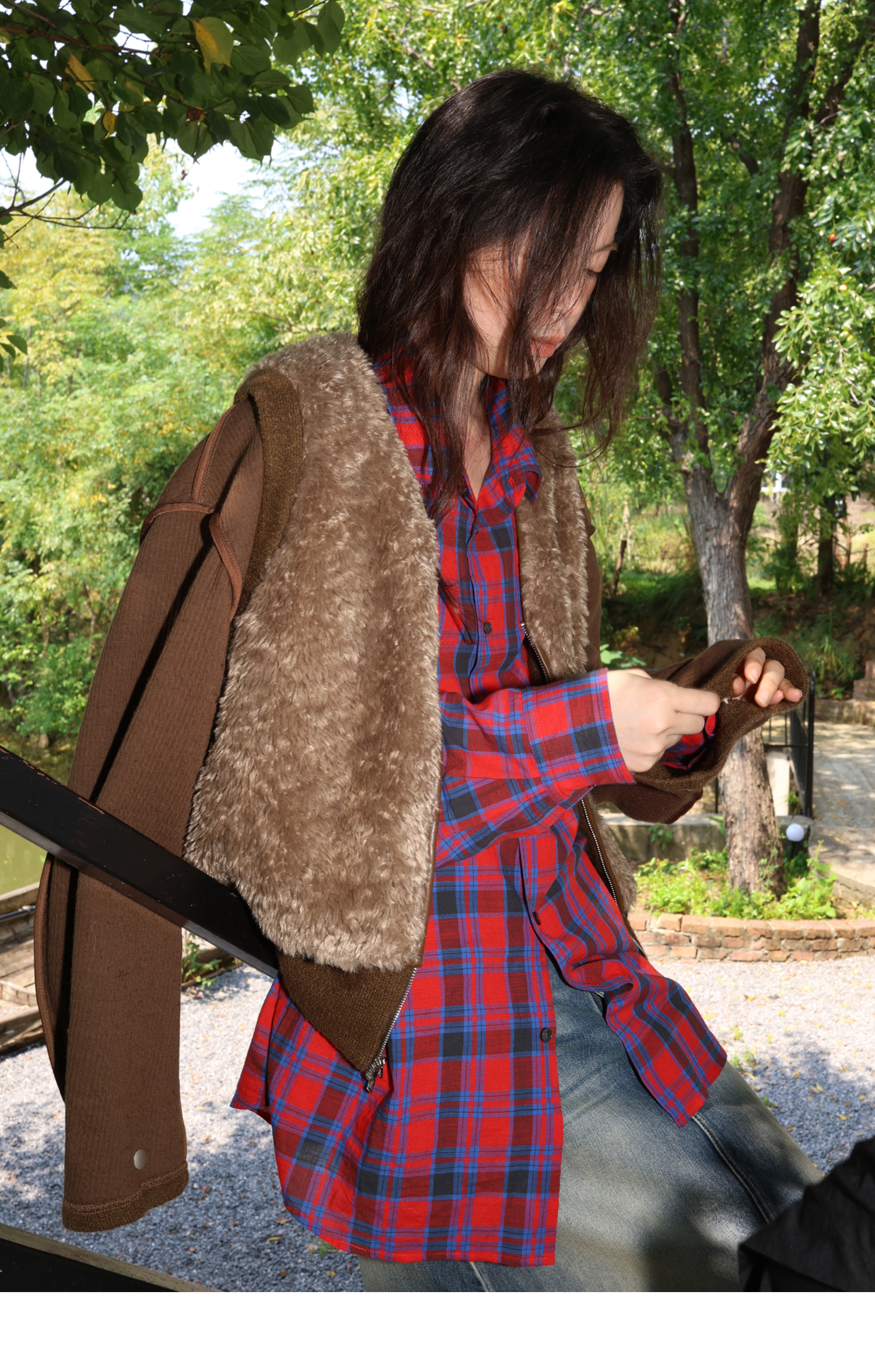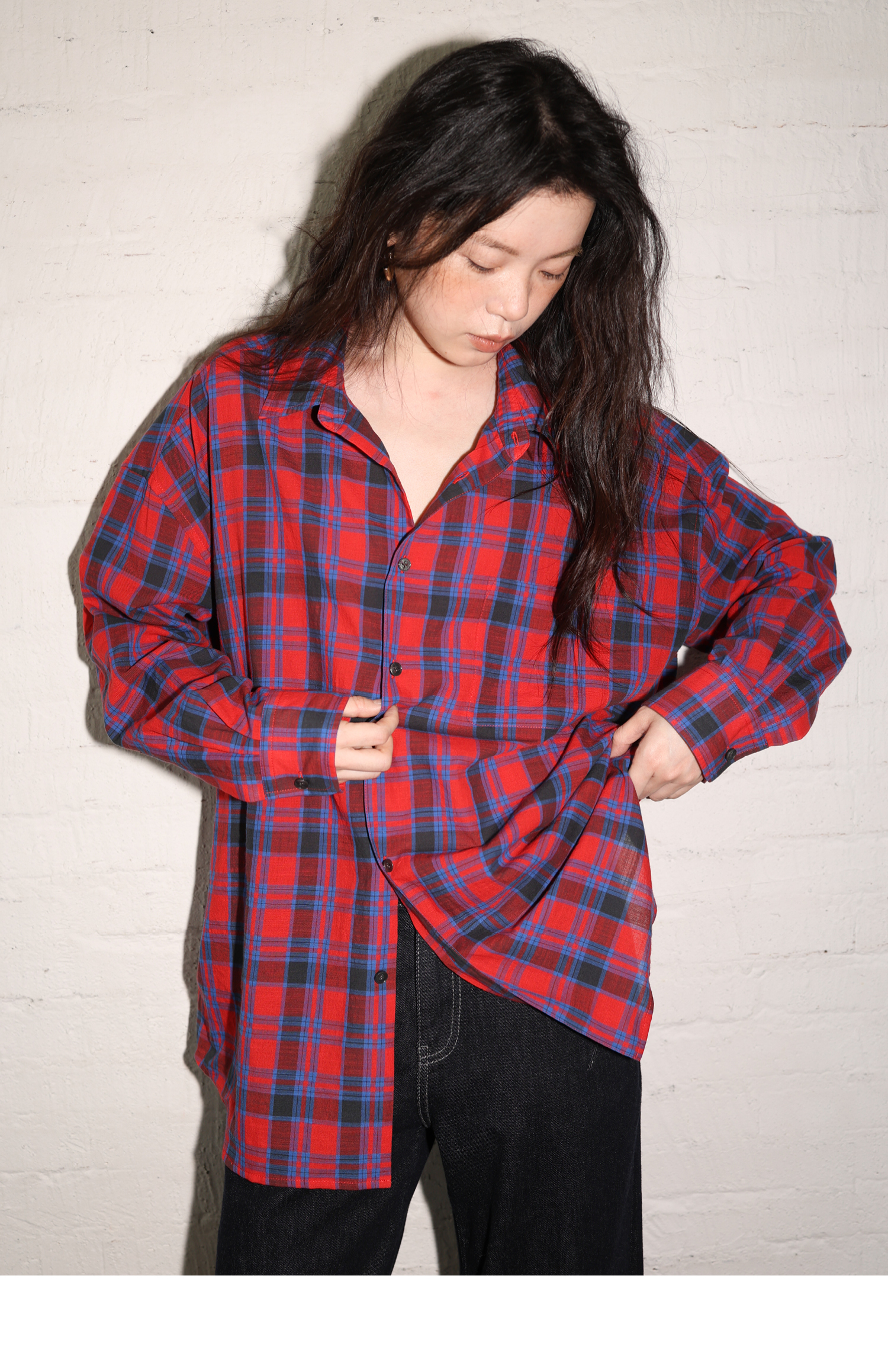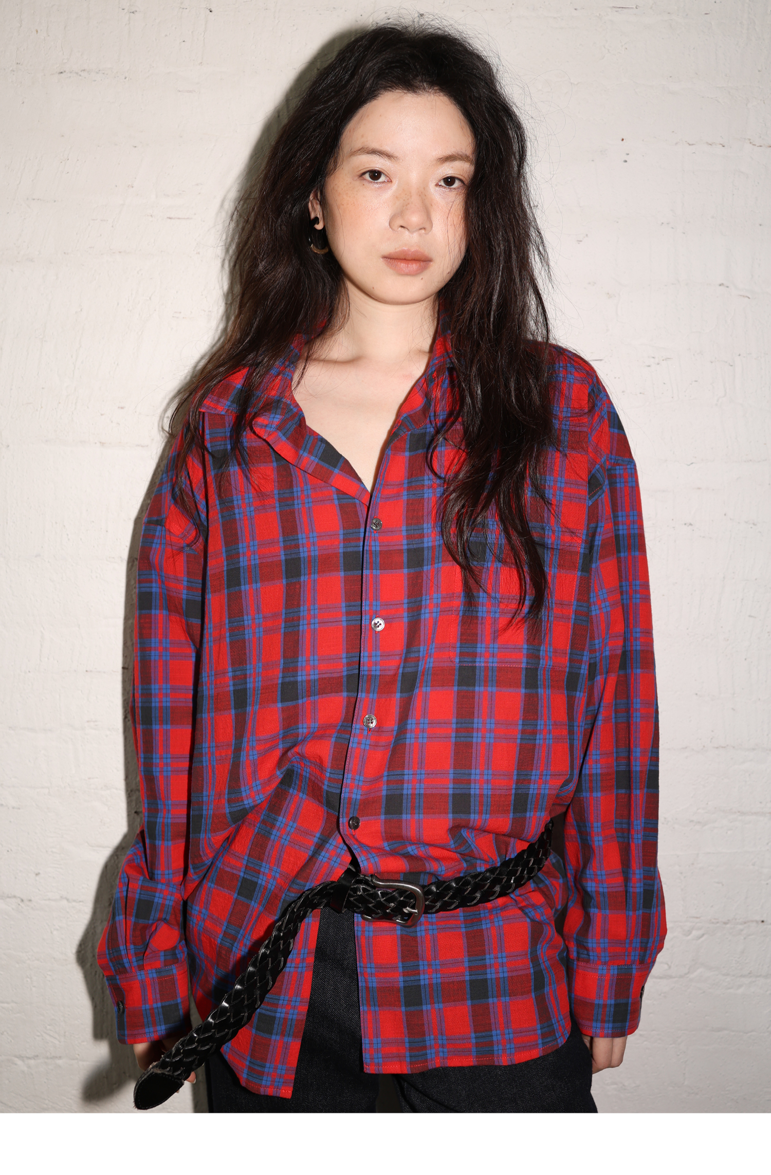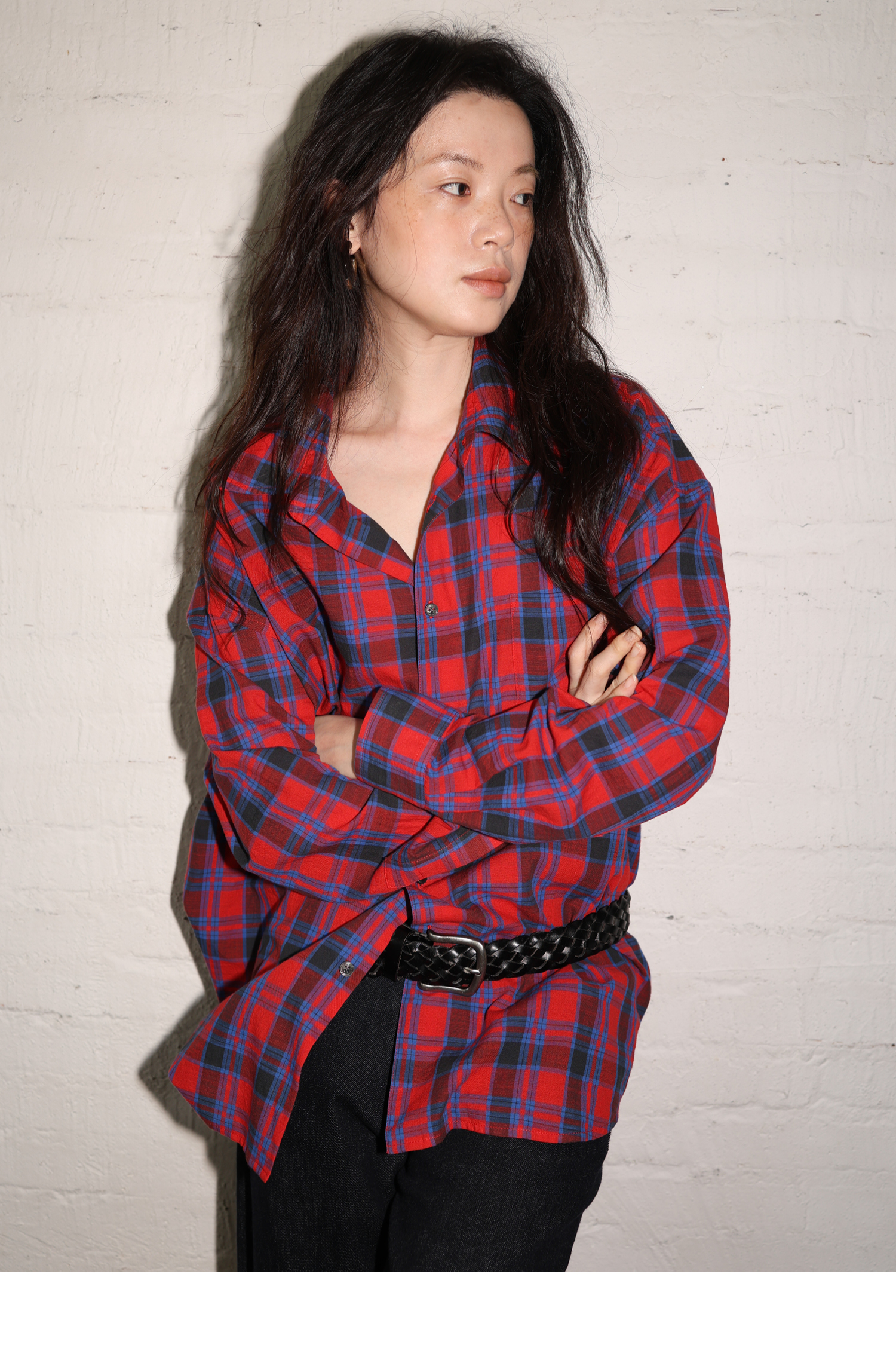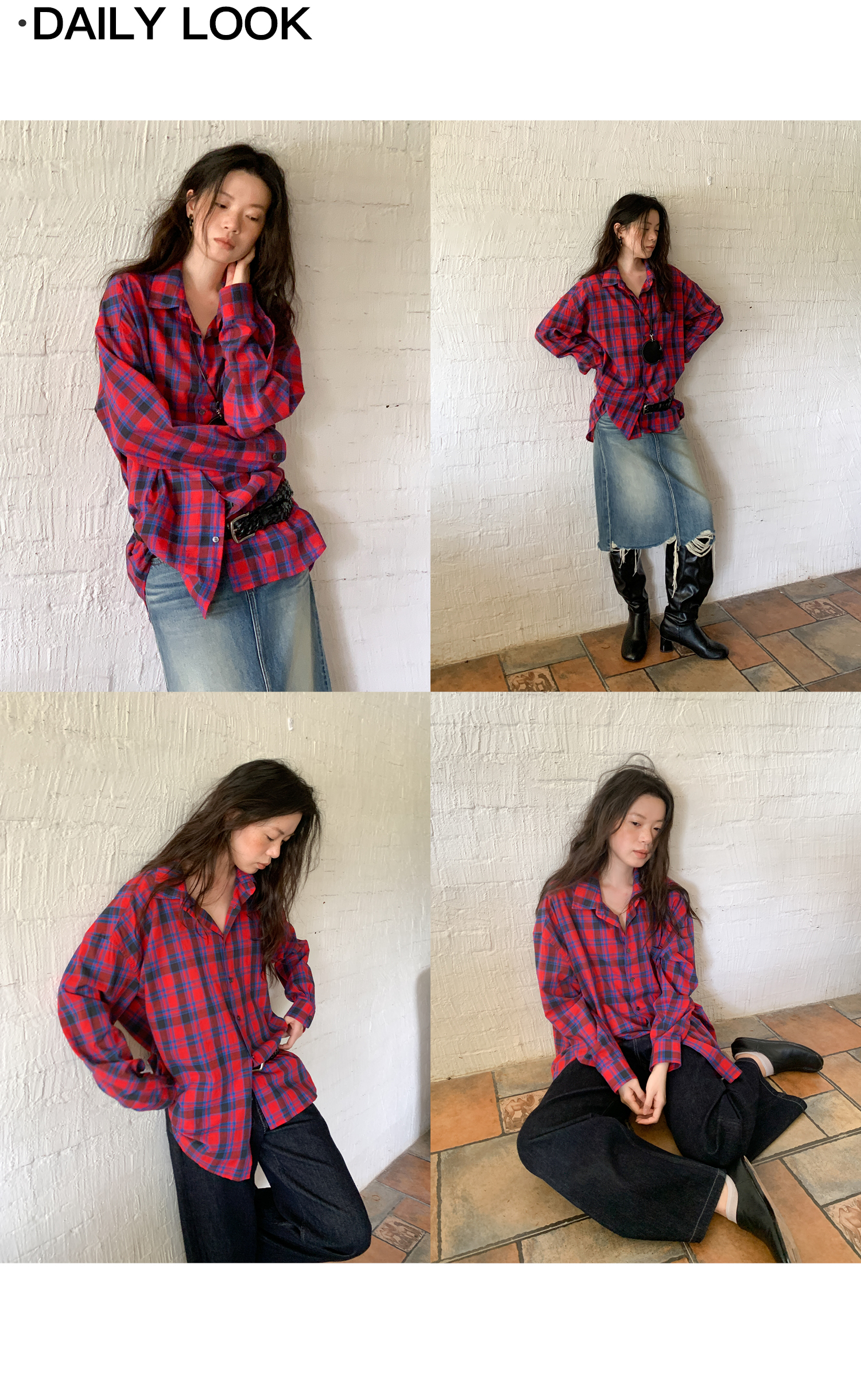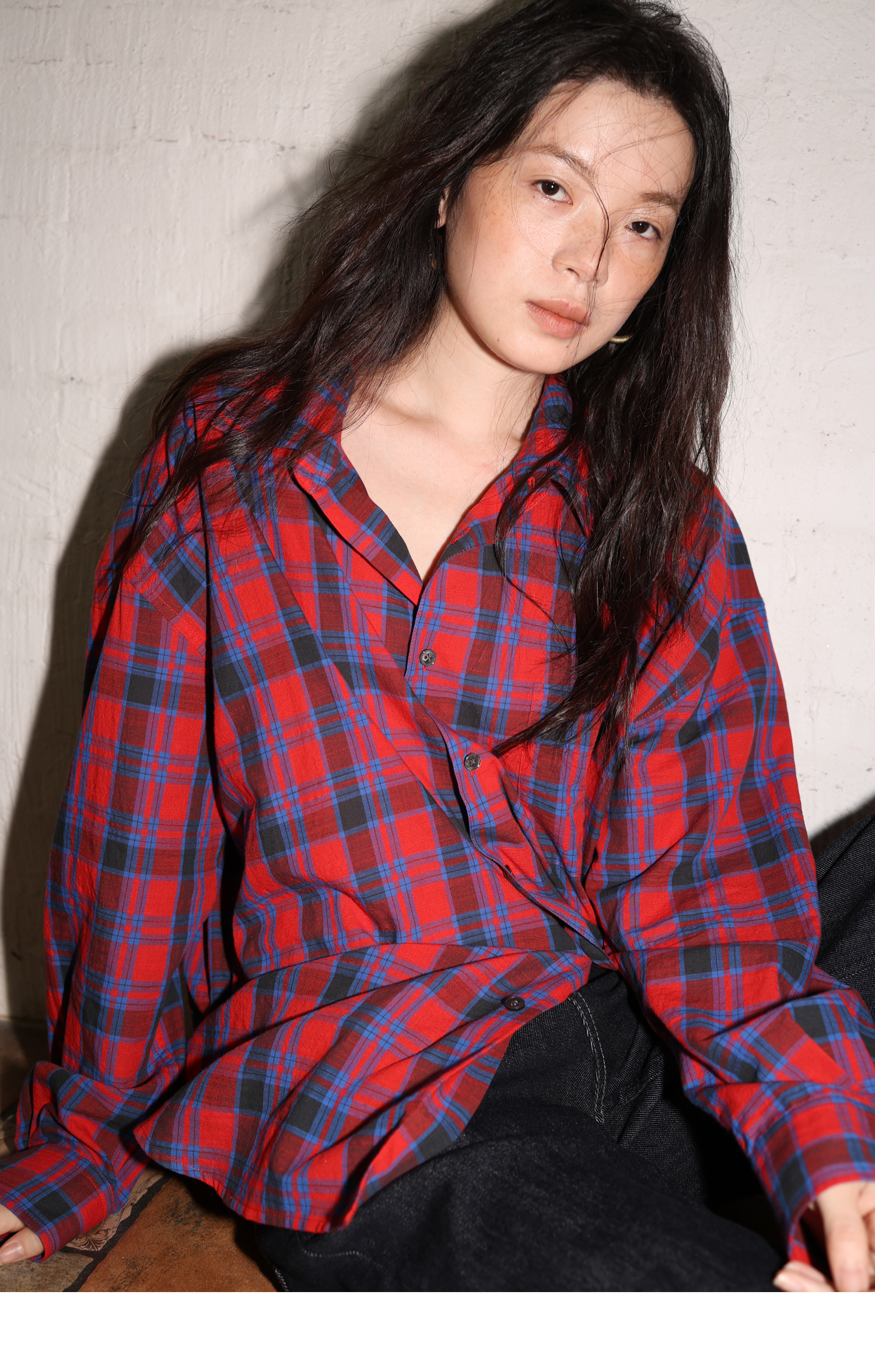 素舶 纯棉柔软舒适经典红格纹撞色翻领宽松复古松弛休闲衬衫上衣