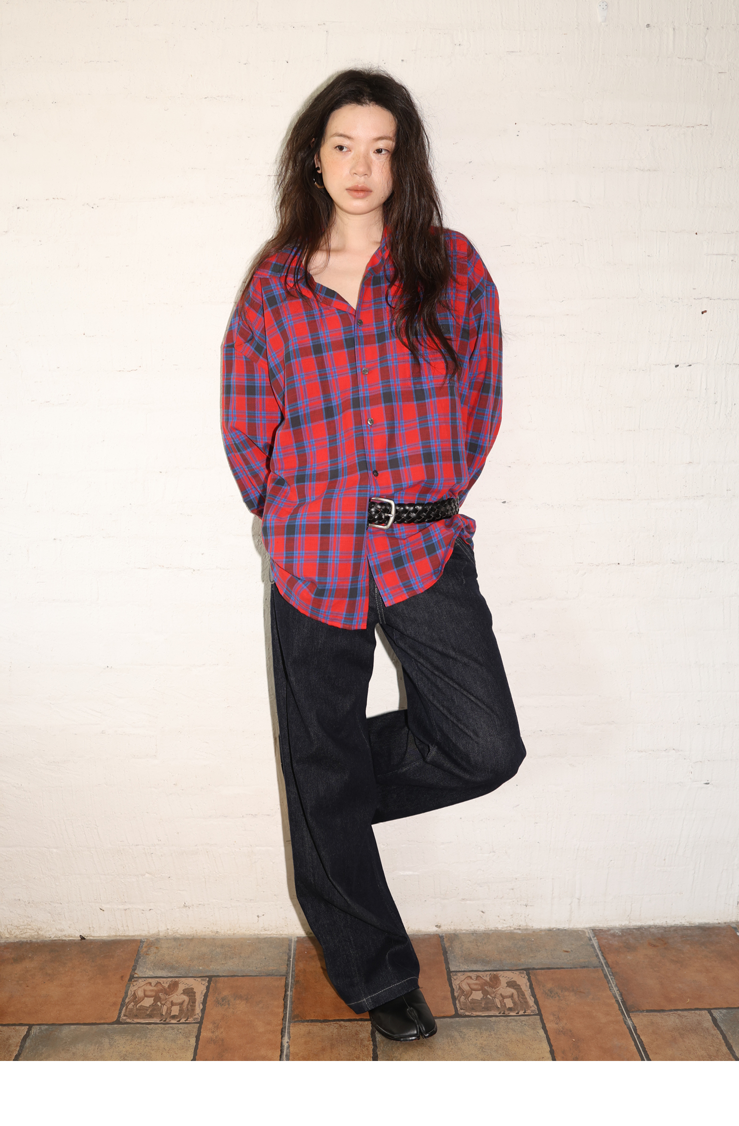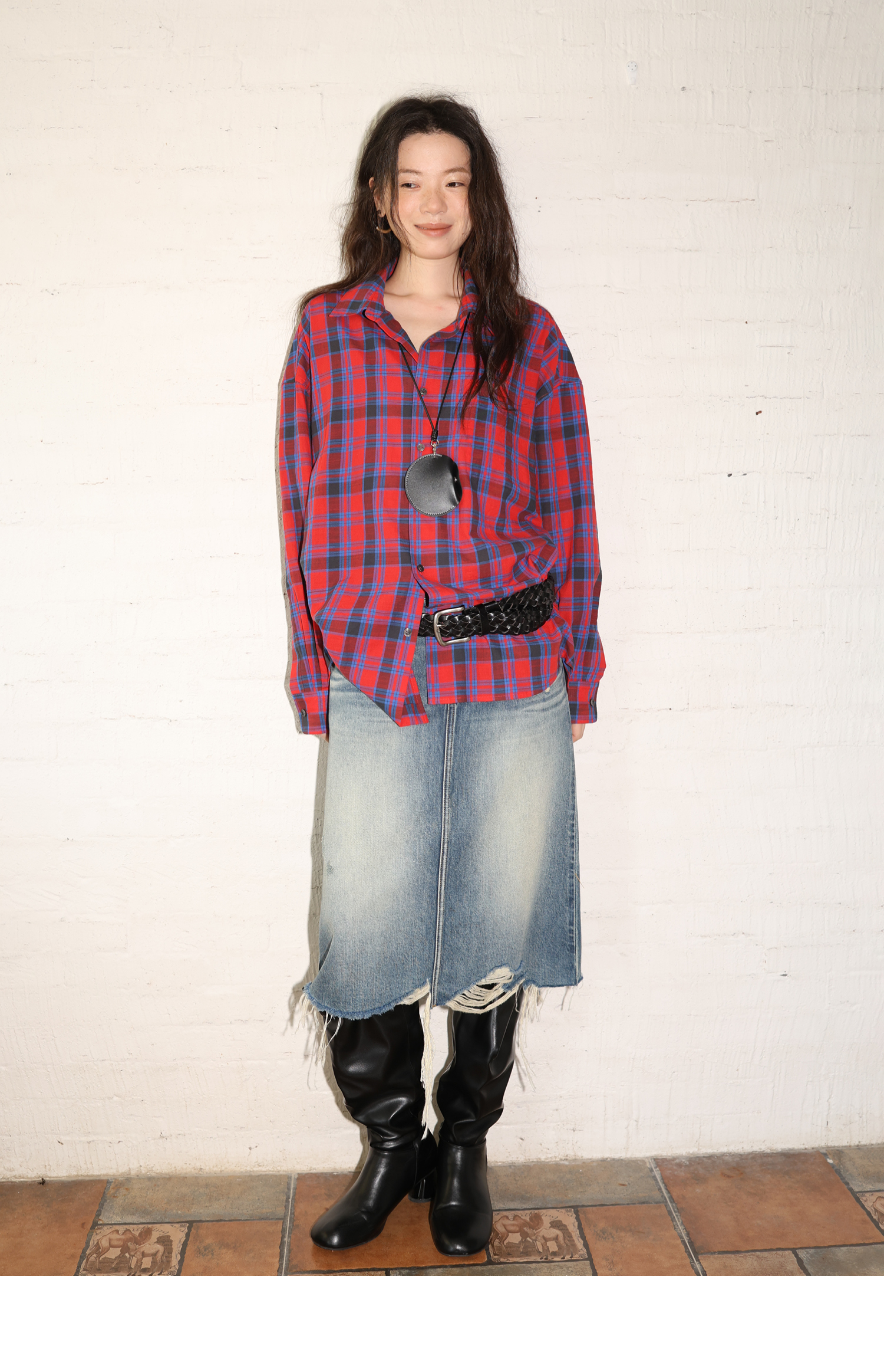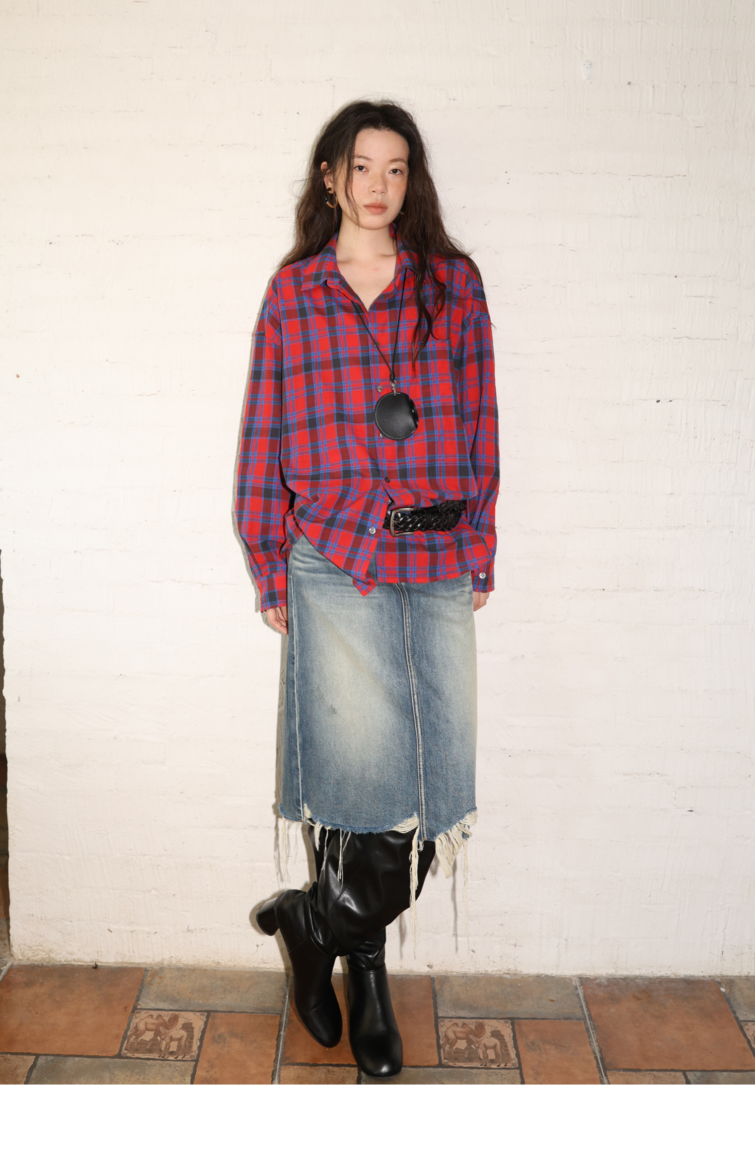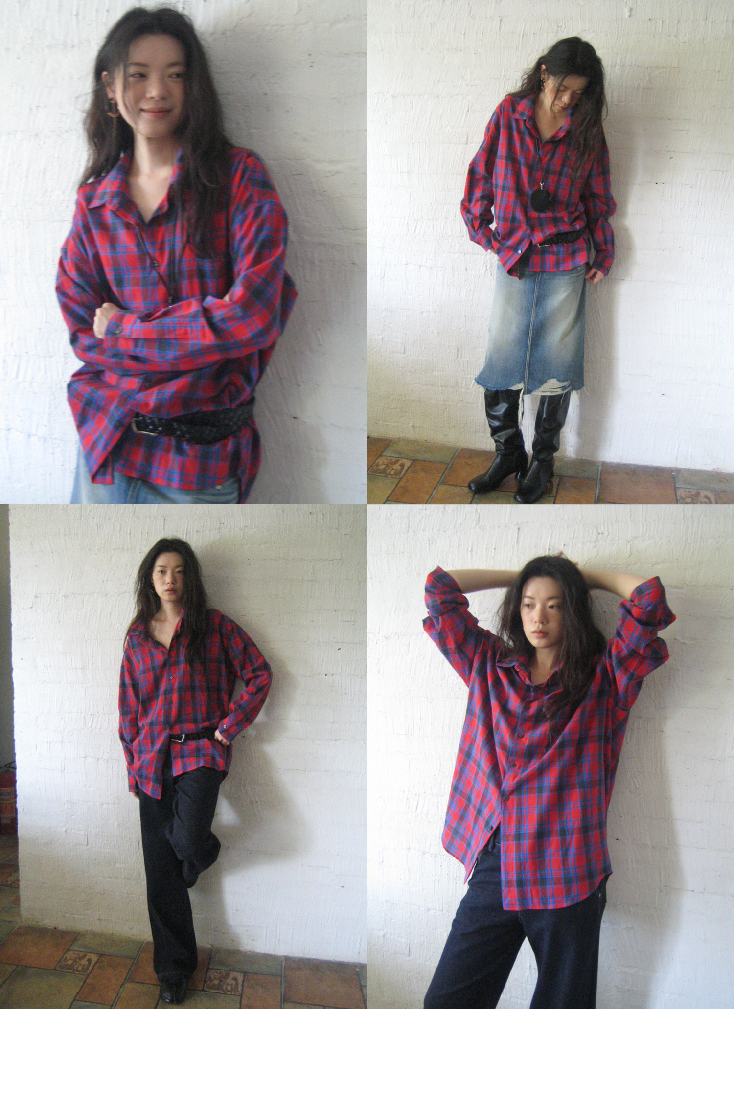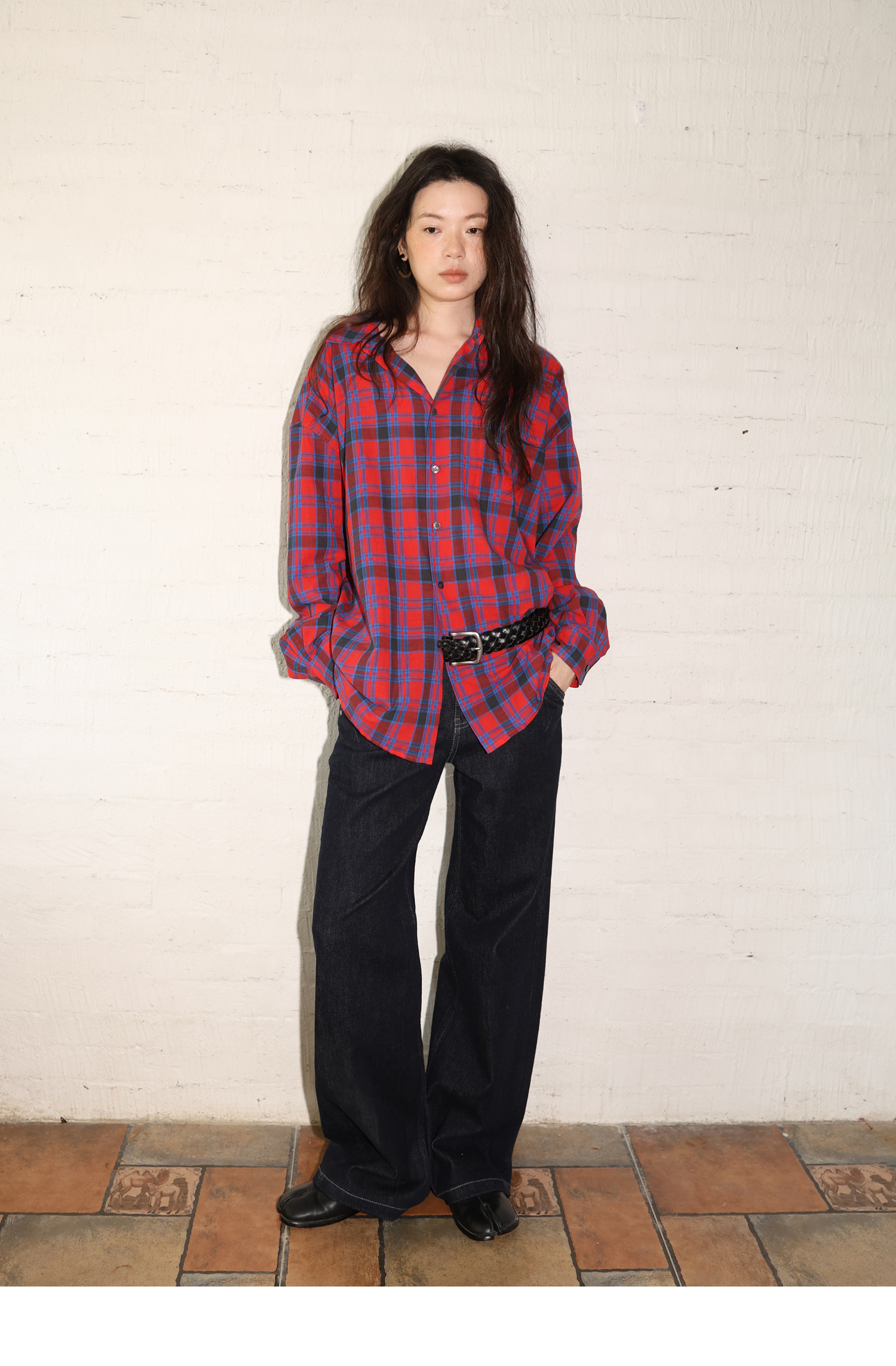 素舶 纯棉柔软舒适经典红格纹撞色翻领宽松复古松弛休闲衬衫上衣