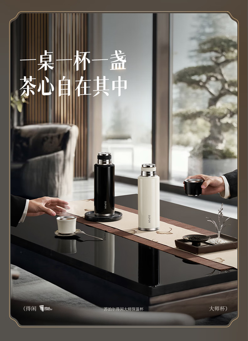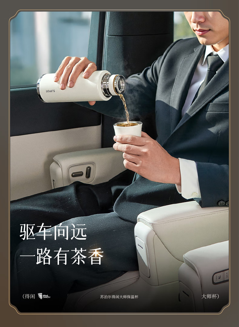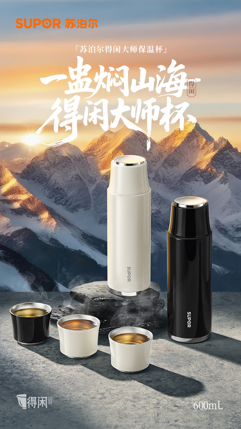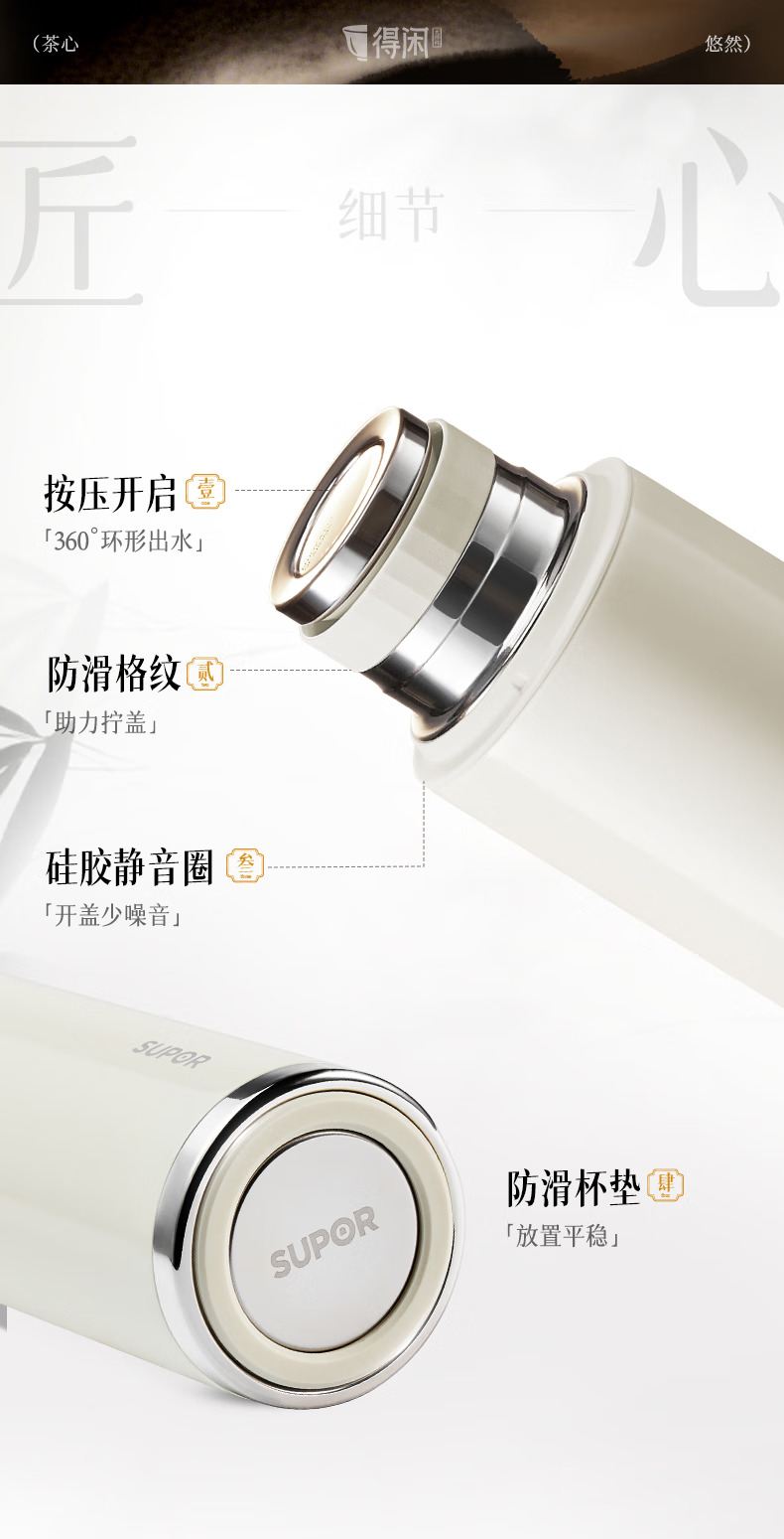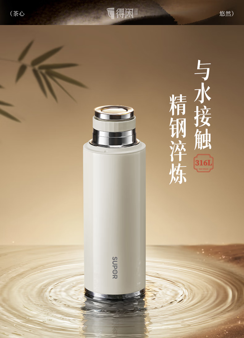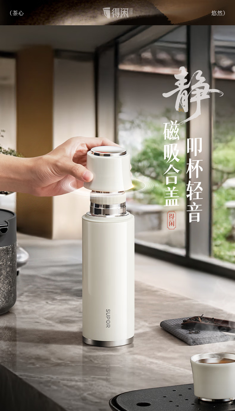 苏泊尔(SUPOR)得闲大师保温杯大容量泡茶焖茶水杯316L不锈钢磁吸杯盖礼物 600mL 羊脂玉-礼盒装60EC10【磁吸杯盖】