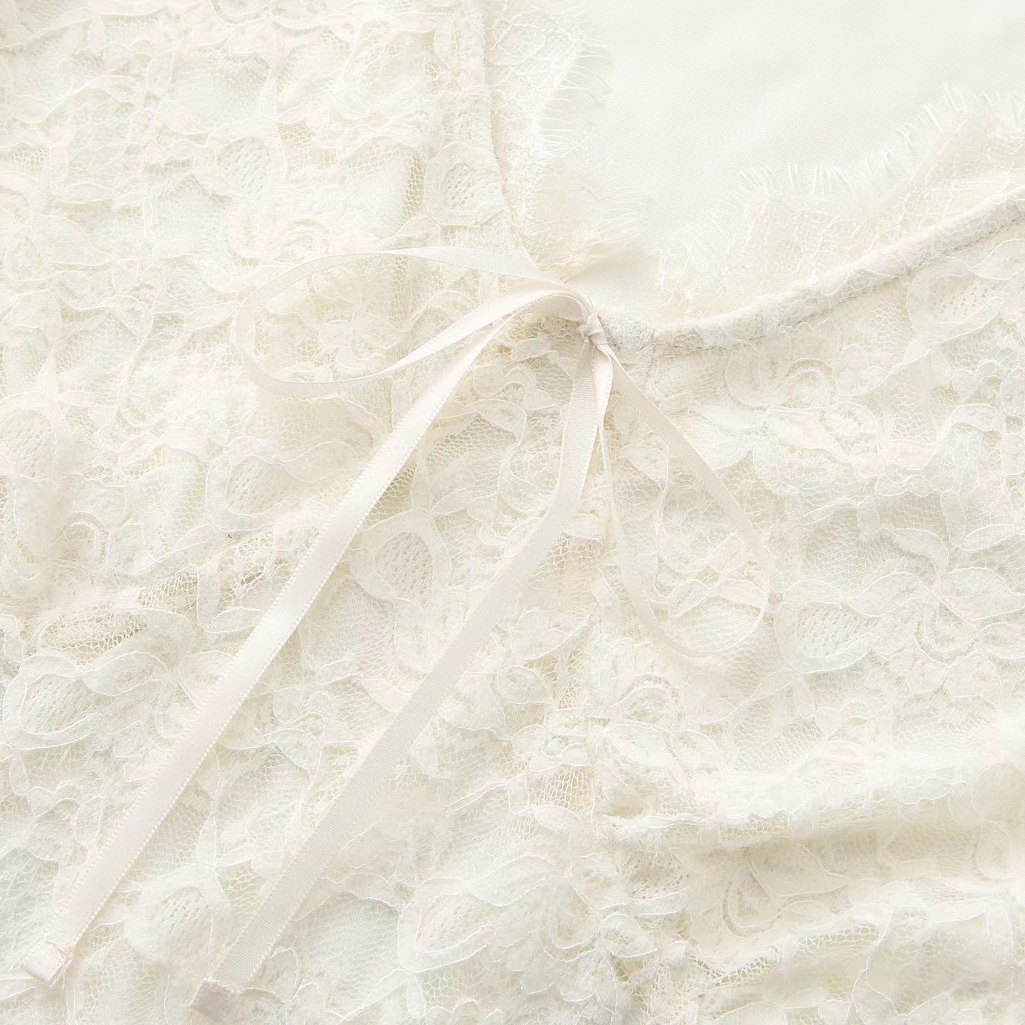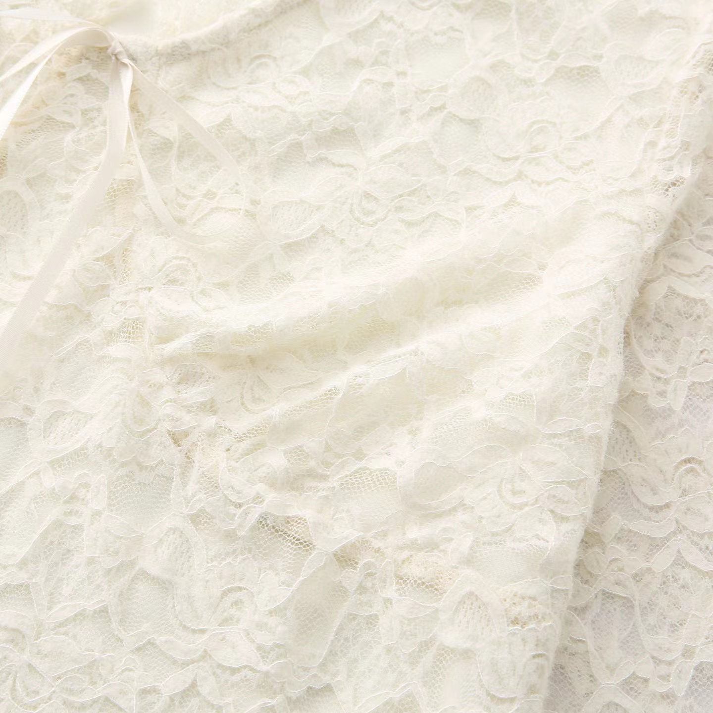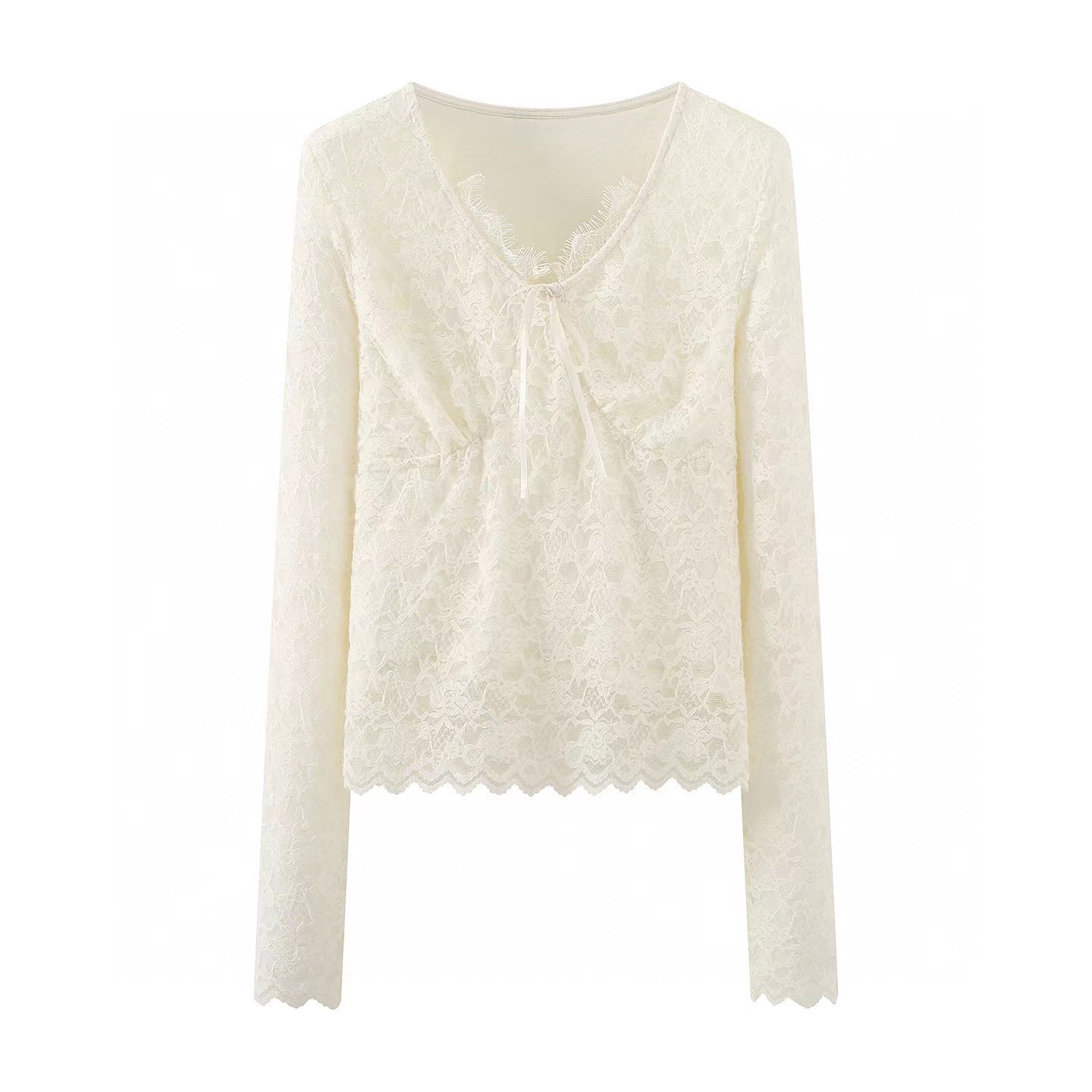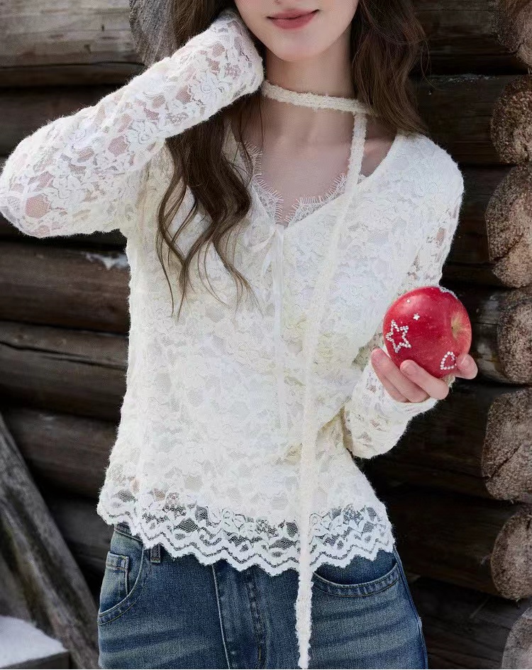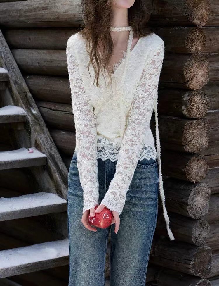 2026春季新款修身打底蕾丝衫小衫V领长袖短款,白蕾丝V领上衣,温柔到骨子里的jing致感,这件蕾丝衫太绝了!系带设计甜妹本命 法式蕾丝打底,单穿内搭都美到犯规 法式白蕾丝V领上衣 | 温柔系穿搭b备。jing致蕾丝工艺:立体花卉蕾丝纹理,质感细腻不扎肤,自带朦胧仙气。V领系带设计:可调节系带打造小V脸视觉,睫毛蕾丝边点缀领口,甜欲感拉满。修身短款剪裁:侧边收褶藏肉显瘦,短款版型拉高腰线,搭配高腰下装超显比例。百搭实穿性:单穿是温柔法式风,内搭大衣/西装,瞬间提升穿搭层次感
