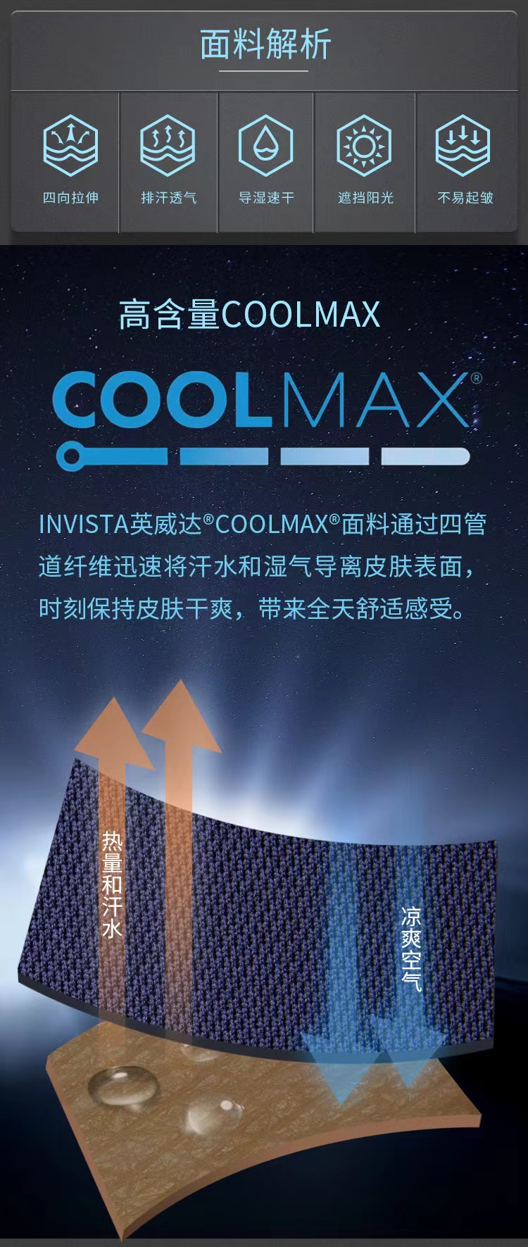 面料:100聚酯纤维Cool Max面料(吸湿排汗)