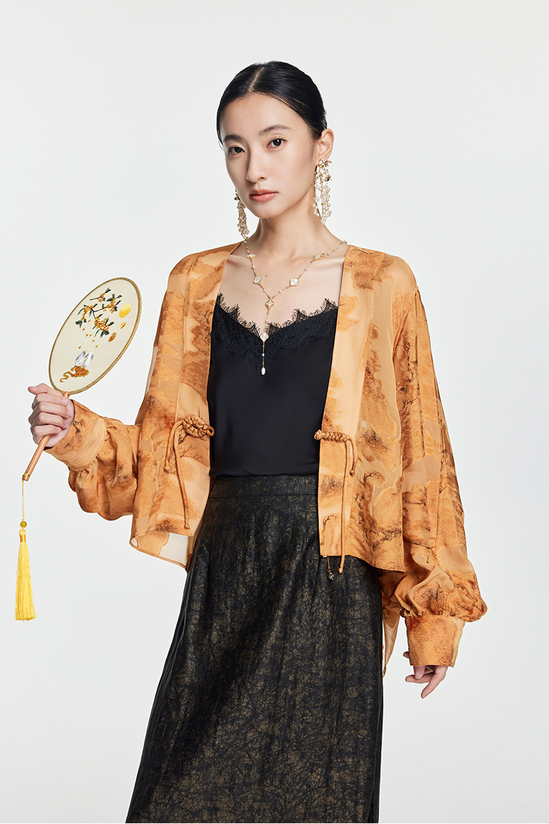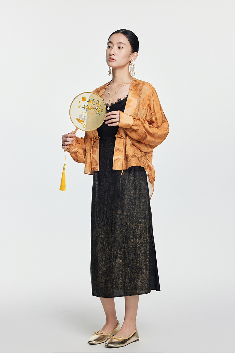 【面料创新】该面料采用传统真丝剪花工艺打造立体肌理,结合精准数码定位印花技术,配合渐变晕染的油画色彩,呈现出媲美浮雕艺术的立体光影效果,既保持真丝柔滑触感,又赋予织物多维度的艺术表现力。