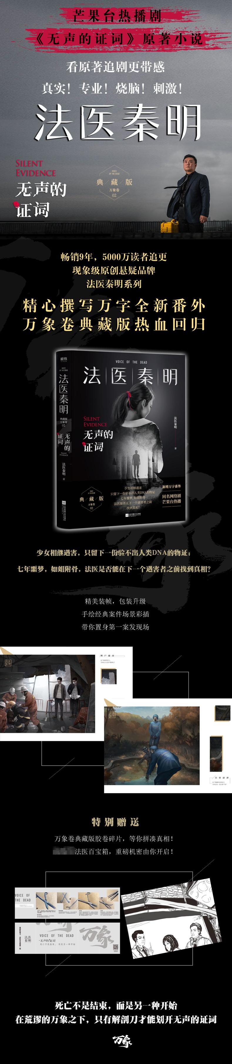 ★畅销300万册原创悬疑品牌,法医秦明系列·万象卷·典藏版热血回归 5000万读者6年持续追更,畅销300多万册,法医秦明系列万象卷第2季《无声的证词》热血回归。死亡不是结束,而是另一种开始。以专业的法医视角,置身案发现场,聆听尸体的无声证词。 出版六年,法医秦明携《无声的证词》全新版本热血归来,精心撰写万字全新震撼番外,完成《无声的证词》的超值升级。全书装帧精美,收录书中经典场景彩插,特别赠送万象卷典藏版胶卷碎片,收集全套解锁完整彩蛋。更有版法医百宝箱工具卡,揭晓法医工具隐含的奥秘。书中还藏有神秘活动,玩转游戏规则,还有机会获得惊喜福袋! ★死亡不是结束,而是另一种开始。在荒谬的万象之下,只有解剖刀才能划开无声的证词。 一桩七年前的家族隐秘,牵连出一串诡异的连环奸杀案,成为猎物的高中女生,能摆脱尾随的那双眼吗?七年过去,悬案迟迟未破,遇害少女的人数却在悄然增加。那些死不瞑目的高中女孩,到底是被什么样的魔鬼给盯上?隐藏在尸体中的无声证词,又将指向什么样的真相? ★50亿播放量,法医秦明同名影视剧正在热播,看原著追剧更带感 从网剧《法医秦明》《法医秦明2清道夫》《法医秦明之幸存者》到电影《秦明·生死语者》,由小说改编的影视剧的播放量早已突破50亿。阅读原著小说,追剧更带感!