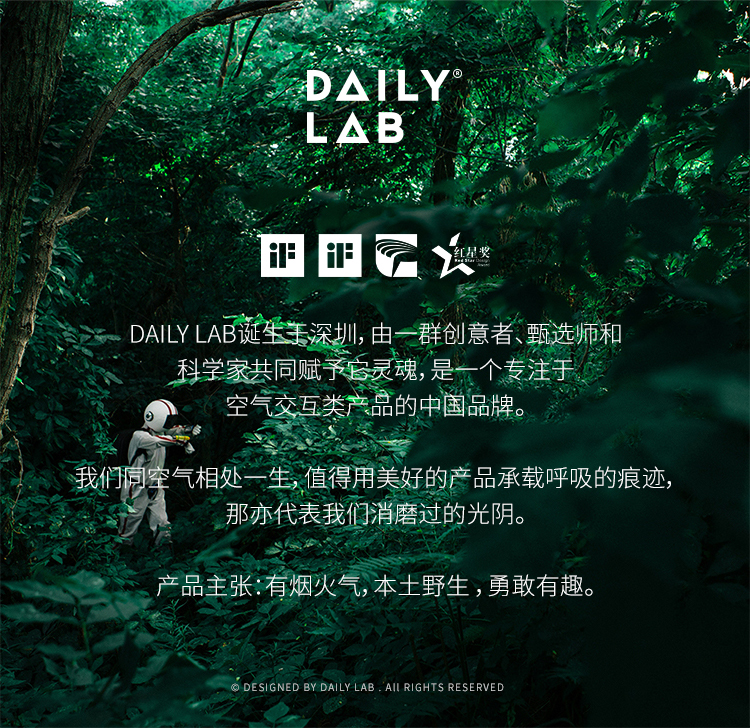 - DAILY LAB|日常实验室,立足东方美学,是专注于「香气可视化」的轻奢空气交互品牌。