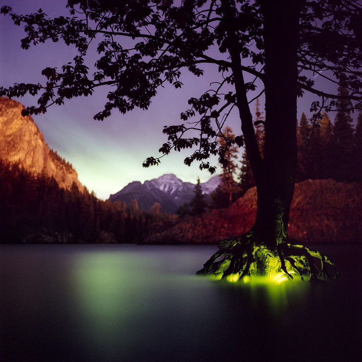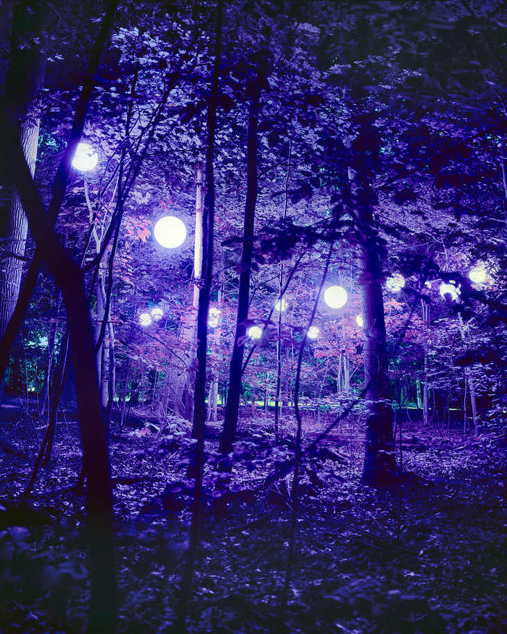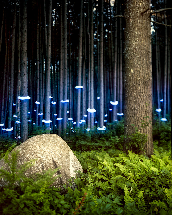 浩瀚莫测的大自然在诉说着那些不为人知的动人传说,缓缓召唤出了隐藏在大地深处等待被释放的自然之灵。美国艺术家Barry Underwood用他特有的观察法创作了一系列灯光装置作品。他在熟悉的自然景色中找寻可能存在的,飘渺的发光体,在空间中注入他创作的雕塑灯光。他先确定一块户外场地,然后在这一自然环境中加入发光体,这些灯光和色彩为原本平凡无奇的环境添加了抽象的空间质感。最终,Underwood创作了一系列超现实的,戏剧化的叙事性作品。