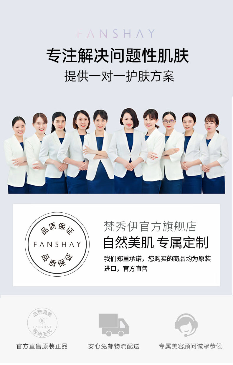 梵秀伊(FANSHAY),为女性肌肤问题提供专业性的综合解决方案,从根本上调理肌底层细胞,并坚持以天然植物萃取精华。产品以草本植物为重点,取中草药之精华,辅之现代高科技提纯技术,让肌肤由内而外深层改善