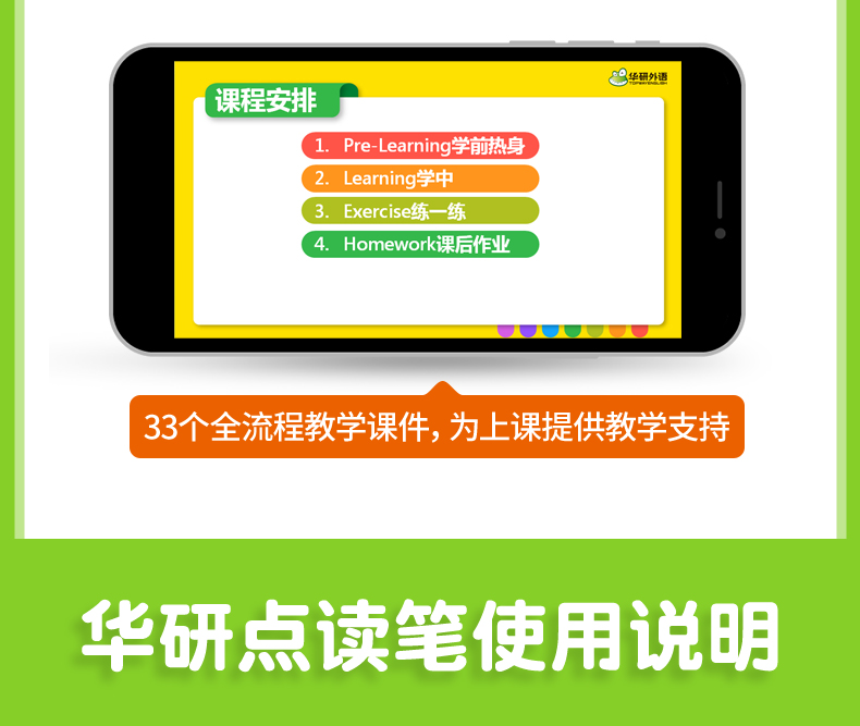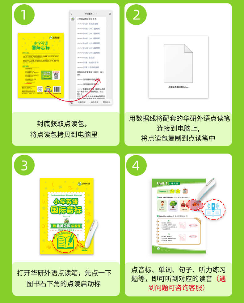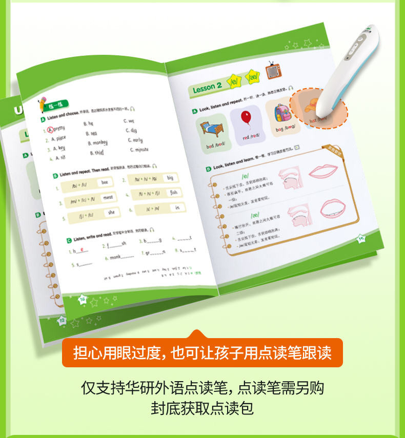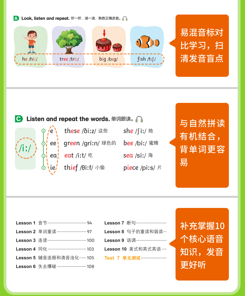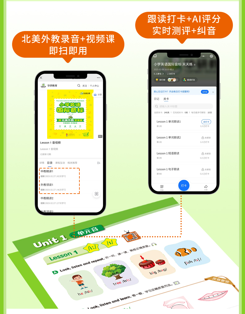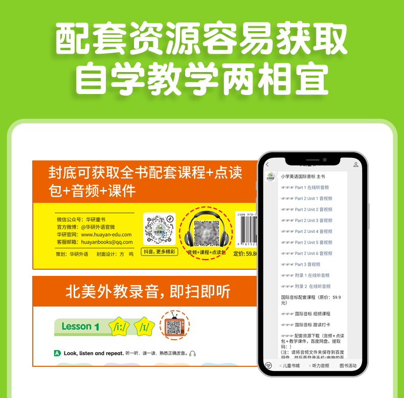 6. 所有音标、单词、词组、句子和听力练习题均配音频,由北美外教录制,发音纯正,即扫即听,方便学习,也可搭配“华研外语”点读笔读使用(点读笔需另购)。