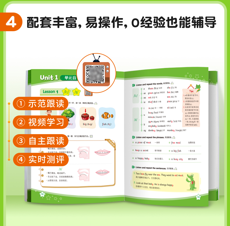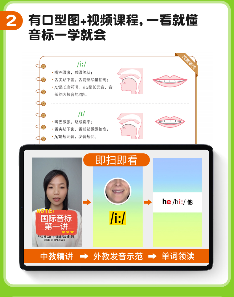 1. 所有音标均提供发音口型图和中教详解、北美外教带读视频课,小学生一看就懂,标准发音一学就会。
