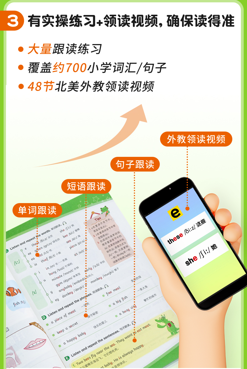 3. 48个国际音标与自然拼读规则有机结合,学生学后不仅能正确拼读全部单词,还能将音形义结合记忆,背单词更容易。
