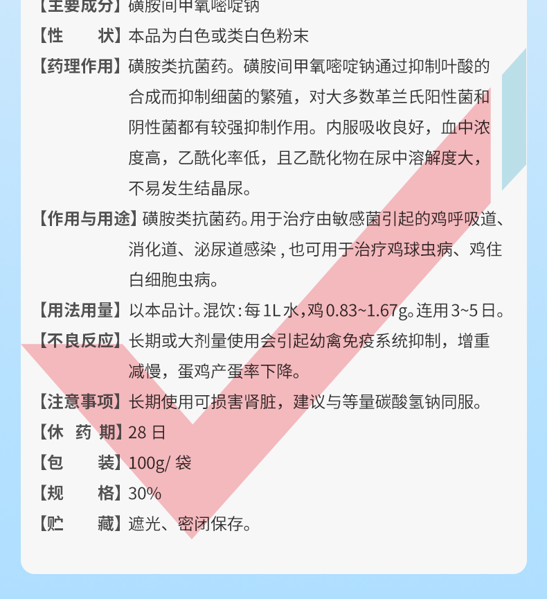 华畜 30%磺胺间甲氧嘧啶呐可溶性粉 呼吸道 消化道 鸡球虫病 泌尿道感染
