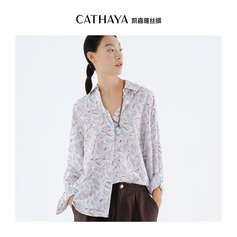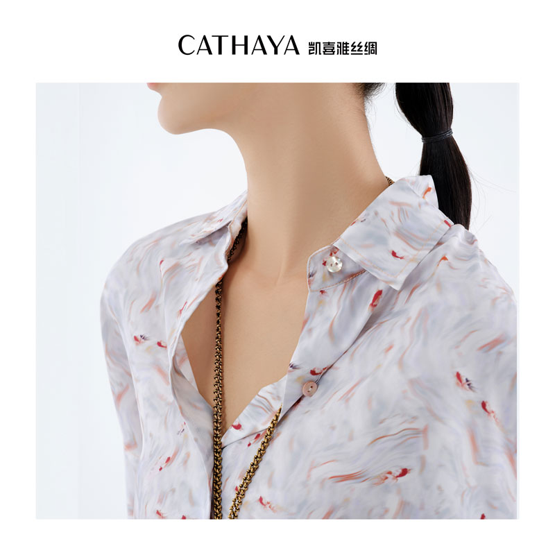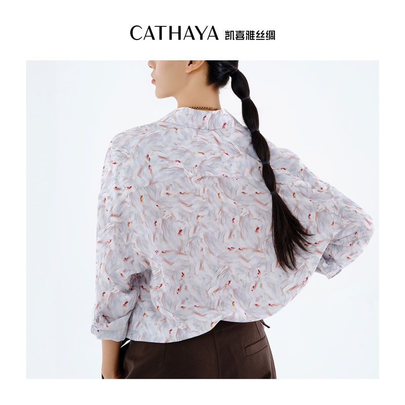 “鱼趣”面料灵感:虚谷的《紫藤金鱼图》中,鱼是实的。设计师把群鱼画成了虚焦的动态,好像整幅画面都动了起来