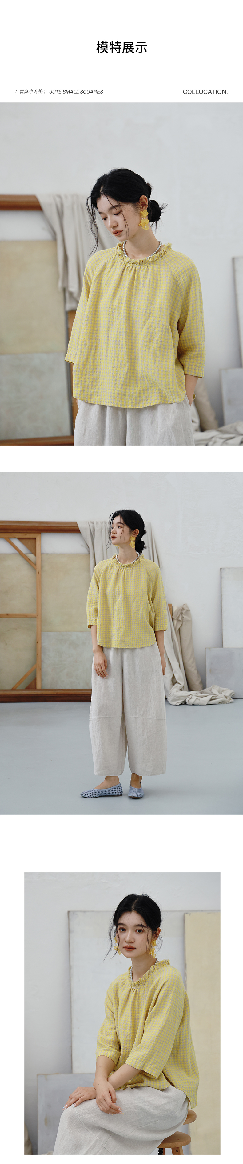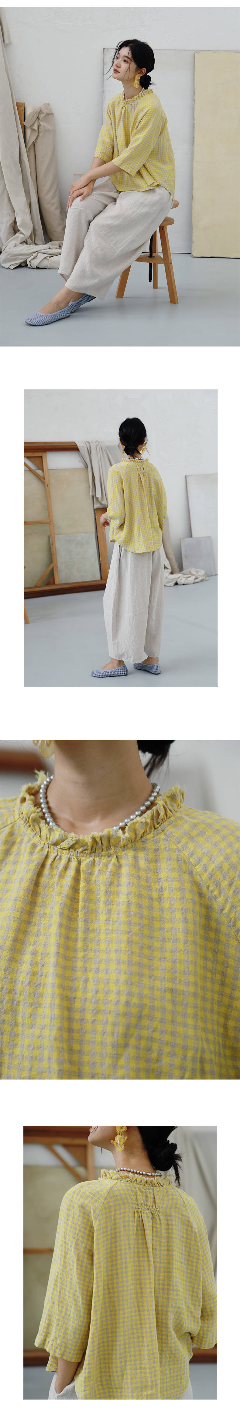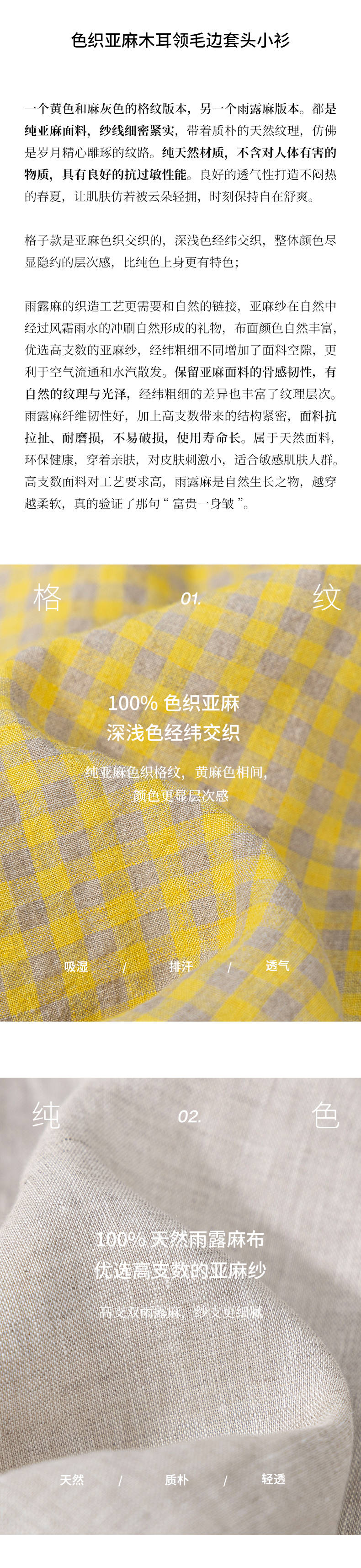 绽放409朵/【莫兰迪系列】色织亚麻小方格高支雨露耳领毛边套头小衫女