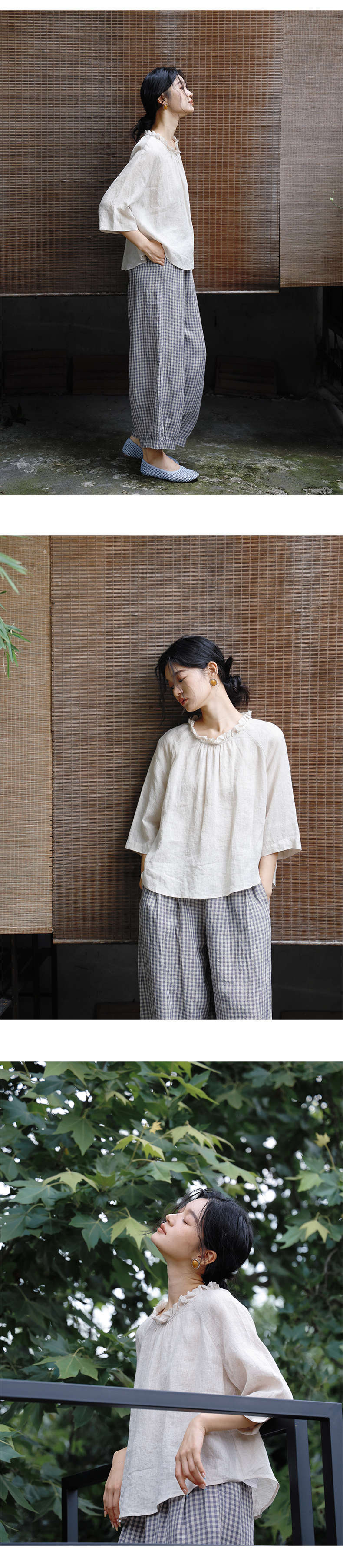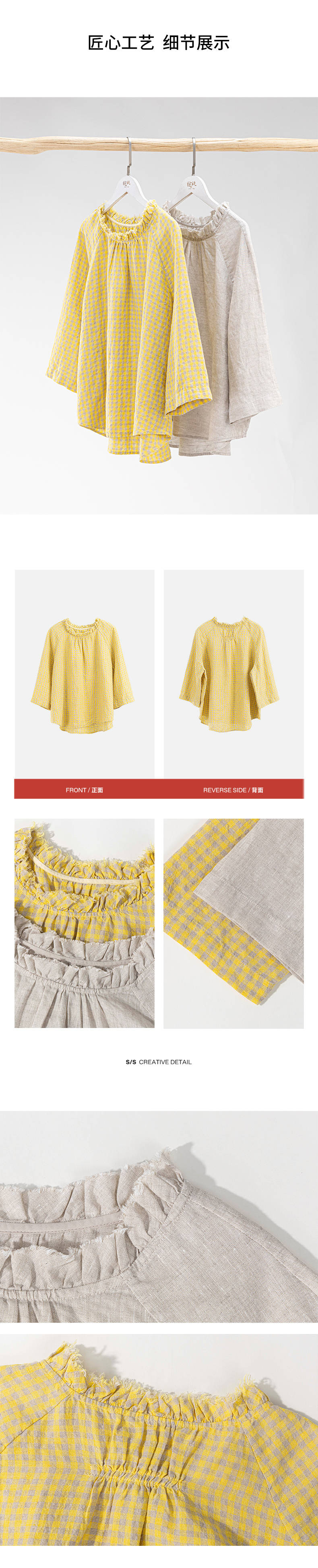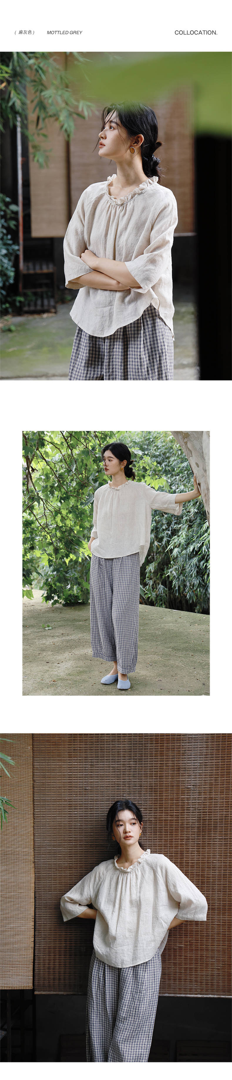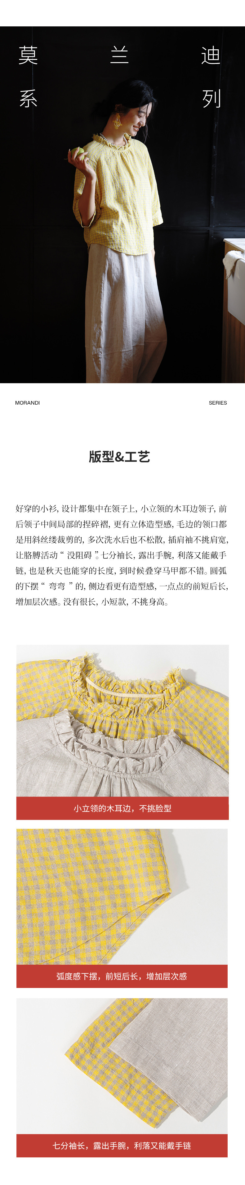 绽放409朵/【莫兰迪系列】色织亚麻小方格高支雨露耳领毛边套头小衫女