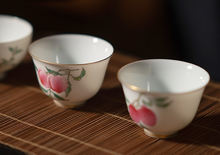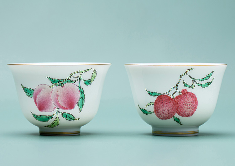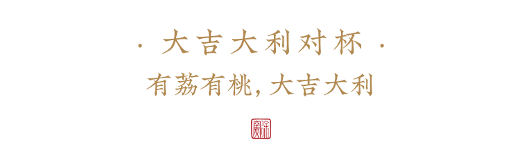 由荔枝与桃组成的对杯寓意大吉大利。宜作为伴手礼送情侣、新婚夫妇。也可自用、赏玩。