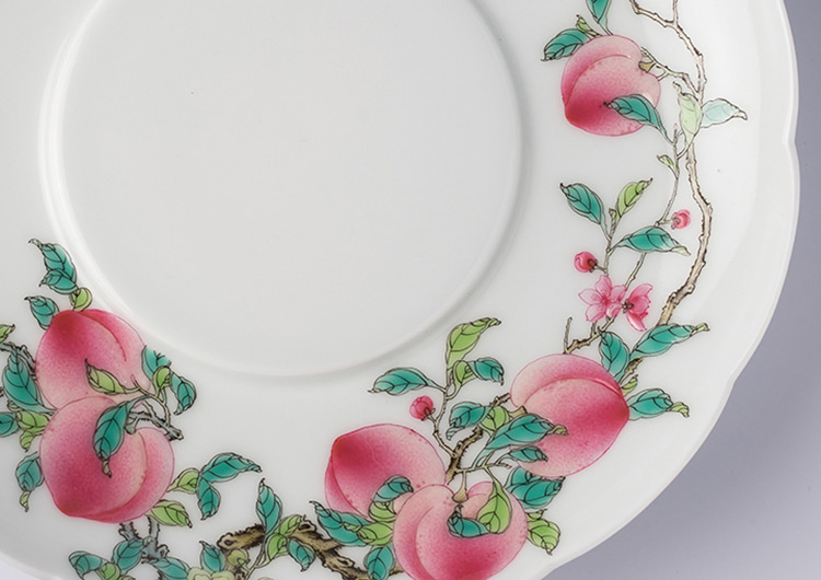 六桃,三两簇拥,在瓷面上描绘出苍劲有力的桃枝、盛开的桃花、红色的桃果实。构图饱满又富有韵律变化,用色淡雅柔丽。