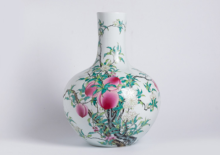 出生陶瓷世家的徐志军更是精通各类瓷器,浩瀚瓷海中最终选择了集大成者的粉彩,并曾跟随黄云鹏复刻上海博物馆八桃橄榄瓶,自此对桃类题材特别钟意。