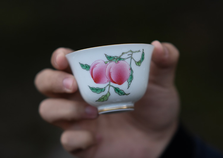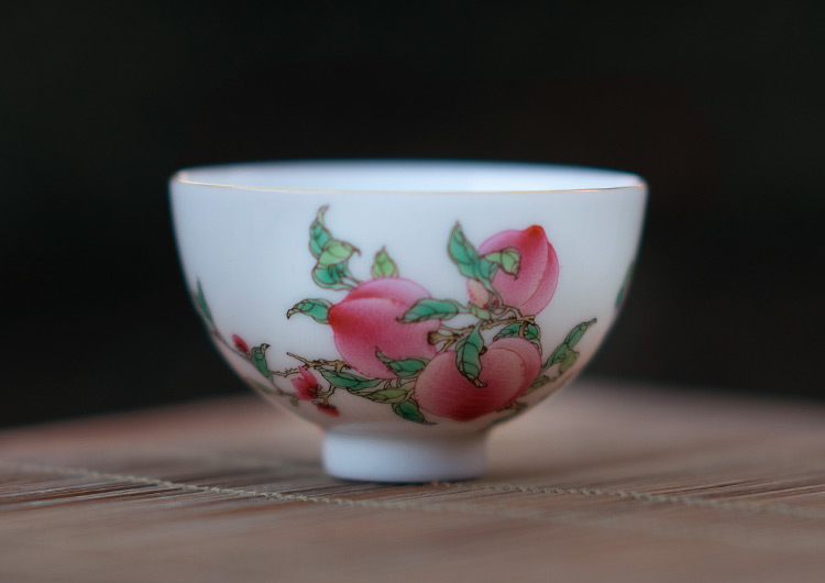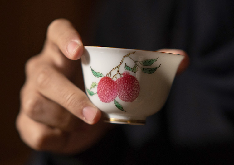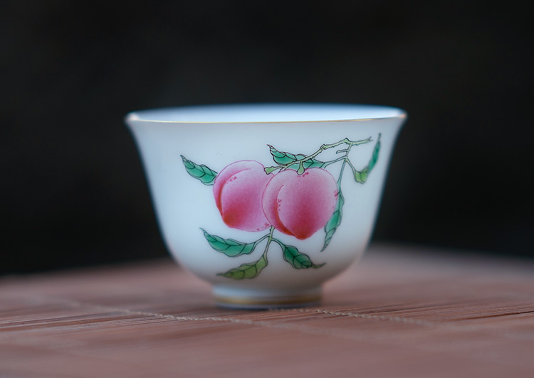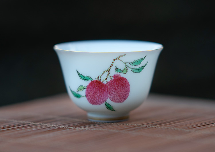 杯沿外撇,腹深口广,口与足部描金。如玉的釉面上,各自绘了一枝红艳艳的荔枝、桃子。画工精湛,果实鲜活逼真。