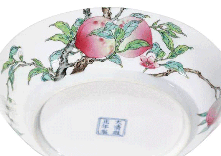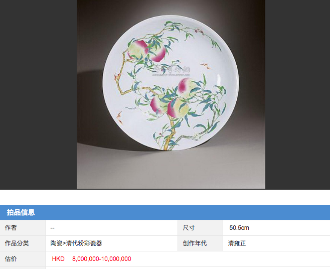 ○ 2004年苏富比一个清雍正粉彩过墙枝蝠桃纹大盘以高达1370多万成交。
