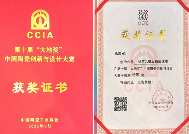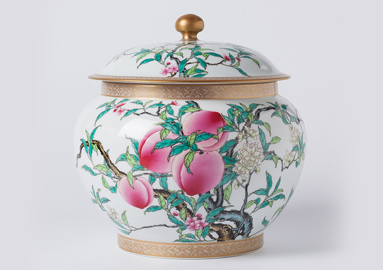 徐窑九桃宝珠罐,集桃、月季、蝙蝠三者于一身,寓意幸福长寿、健康祥宁、崇高纯洁、五福临门。在第十届“大地奖”中国陶瓷创新与设计大赛中荣获特等奖。