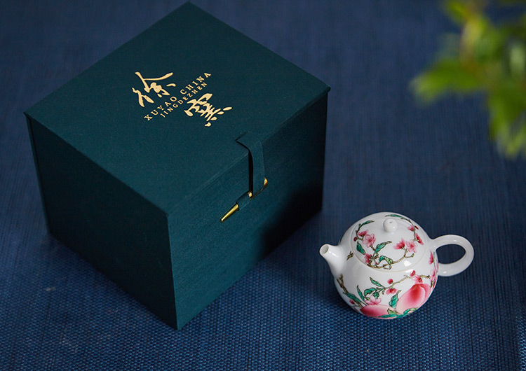器物还定制有精美礼盒,复古绿的盒面烫金“徐窑”,高古典雅。收到的人也一定能感受到你的深情厚谊。