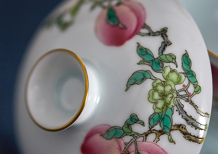 此盖碗整体线条流畅,腹部外鼓,利于聚合香气和味道。分为三部分,盖、碗、托,所对应的正是天、人、地。三个部分分别在外沿施以描金,更显器物雍容典雅。