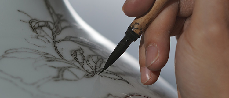 每件粉彩需经素烧、釉烧、烧玻璃白、烤花四次烧制,力求釉面、胎型结合致密,色釉浑然一体。温控严苛,稍有不慎,前功尽弃。