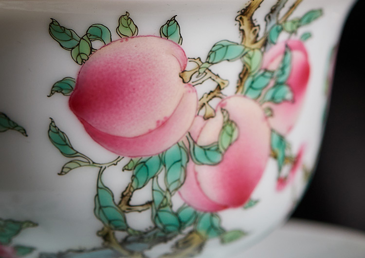难得的是,上面用“过枝”技法,桃干自盖蔓延至碗,绘有九桃,画面浑然一体。