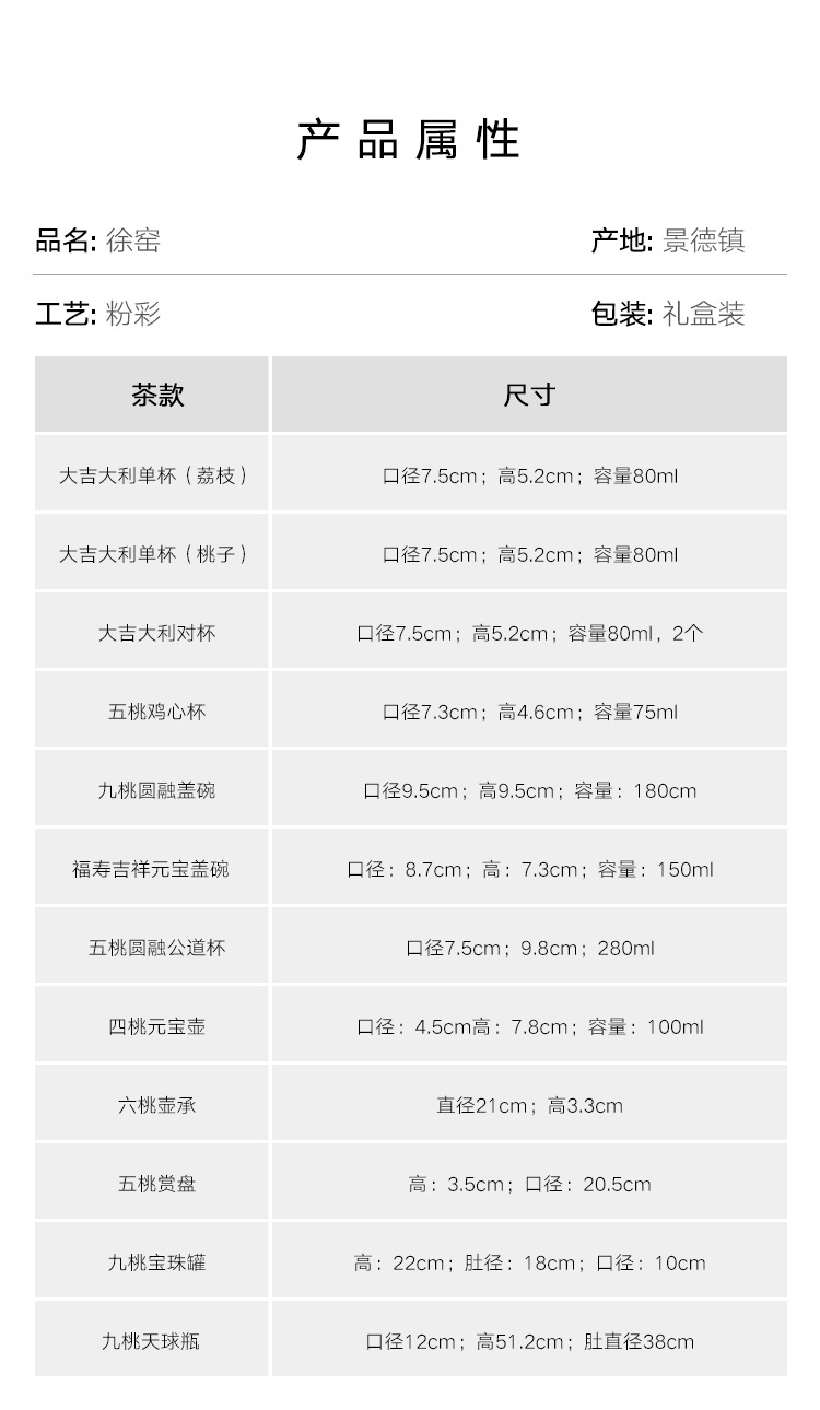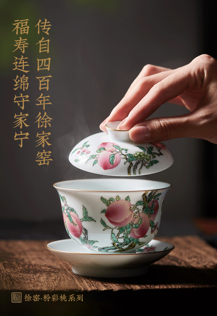 来自景德镇的粉彩世家徐窑,使得粉彩桃纹盘“重获新生”,并衍生有杯子、盖碗、元宝壶、赏盘、壶承以及传统的天球瓶、宝珠罐等……