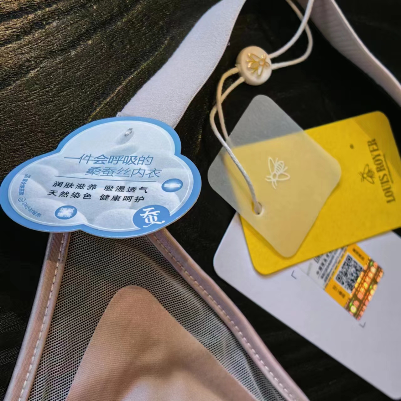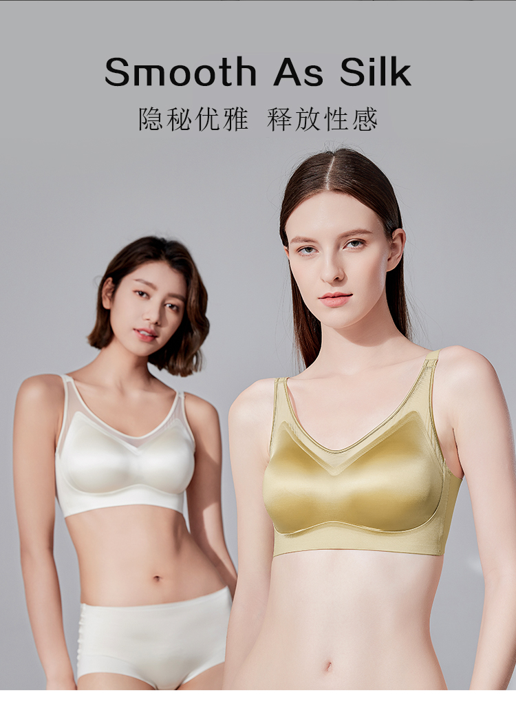 利蜂的鎏金珠光缎蚕丝文胸,里料特意选用进口莫代尔+桑蚕丝+氨纶+锦纶,4种材质混纺,成本特别高!桑蚕丝本身含有多种氨基酸,和人体皮肤化学结构非常相似,不但亲肤舒服,还很透气,用它做内衣里衬,就像给胸部贴面膜,时时刻刻滋润,久待空调房也不容易皮肤干燥,优秀的透气吸湿性又使得它不易滋生细菌!再搭配品质上乘的奥地利兰精莫代尔,又轻又柔,云朵般舒适,就连杯垫也是布满透气孔哦,自由呼吸,穿一天依然清清爽爽!