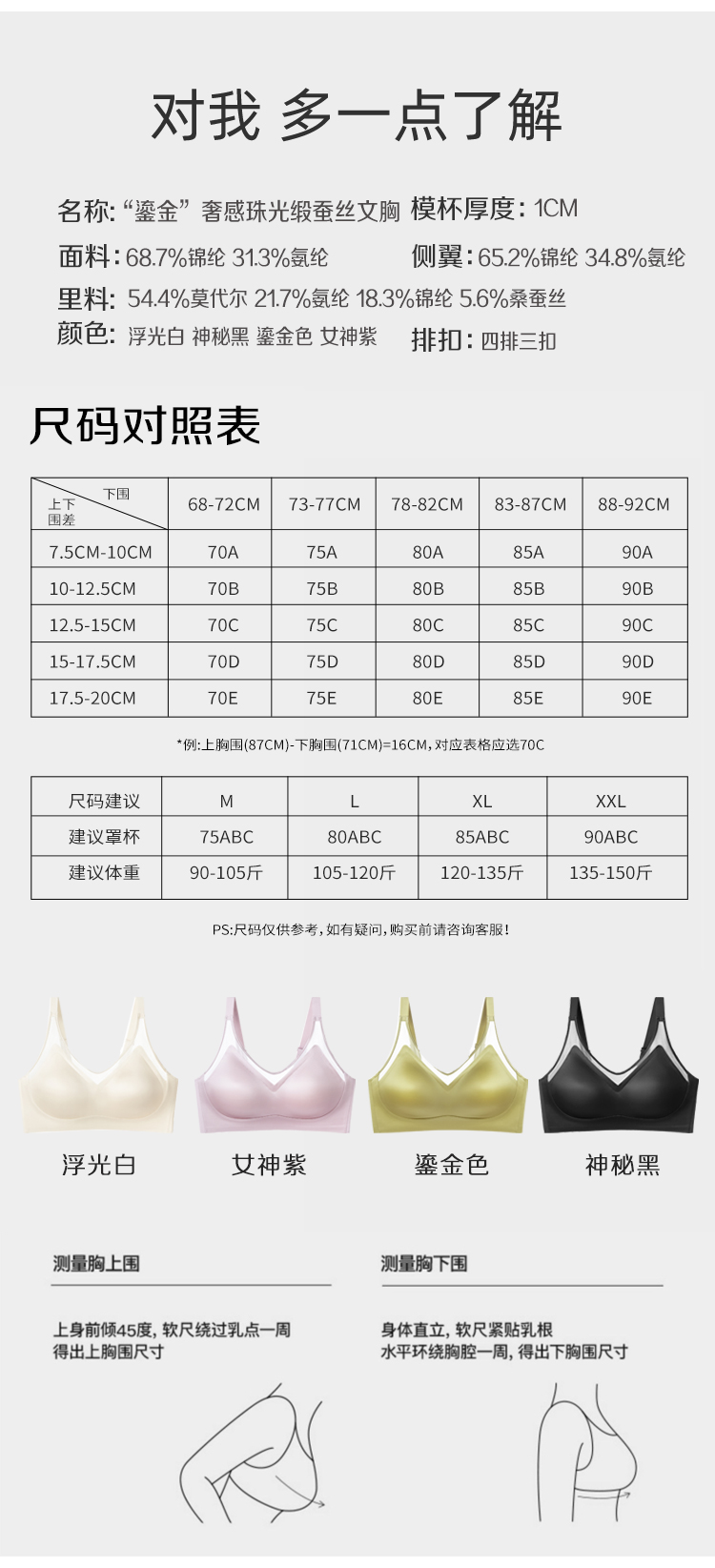 文胸有鎏金色、女神紫、浮光白和神秘黑四色。尺码也很齐全,从M到XXL,满足不同身材需求,我自留的浮光白和女神紫,肤感和颜值双双在线!上身舒适无痕,W形双层果冻胶轻松承托,提拉收拢效果也超好,小胸自然挺拔,大胸圆润不下垂!给自己换新的同时,也可以给妈妈也一起换换哦!