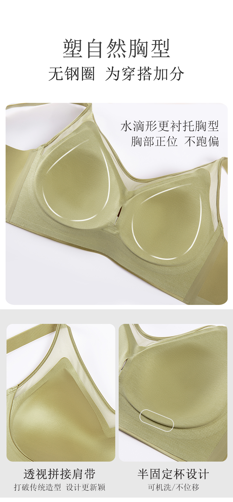 除了面料,设计也非常贴心,采用适合亚洲女性的科学美胸设计,W型双层果冻胶条,沿着胸部曲线,全方位提拉支撑,塑形效果杠杠的!胸垫则是3D立体水滴形+半固定杯,完美兜住胸部肉肉,不易跑杯、位移,还有加高加宽的侧边,副乳也能遮得严严实实!下围还做了加宽,肉肉妹子穿上之后也丝毫没有束缚感,不怕勒红勒伤!