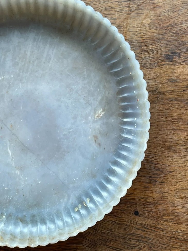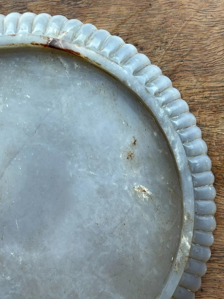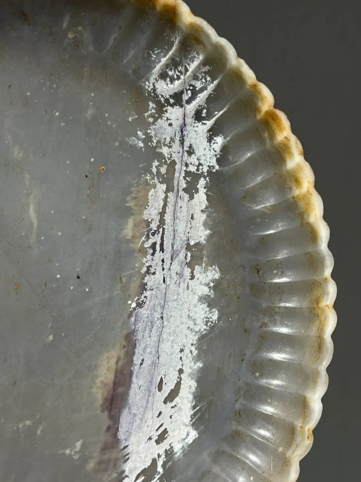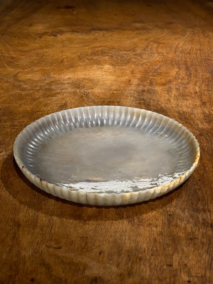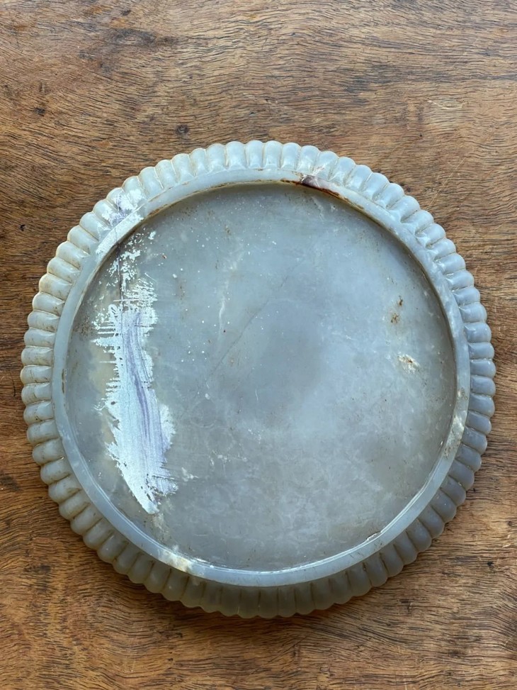 此天然玛瑙雕菊花式浅盘,如图所示,因胎薄曾折断后,以旧式黏着剂修补留下明显痕迹黏着,可以找专业修复人员清除黏着剂后刨光恢复玛瑙光泽。