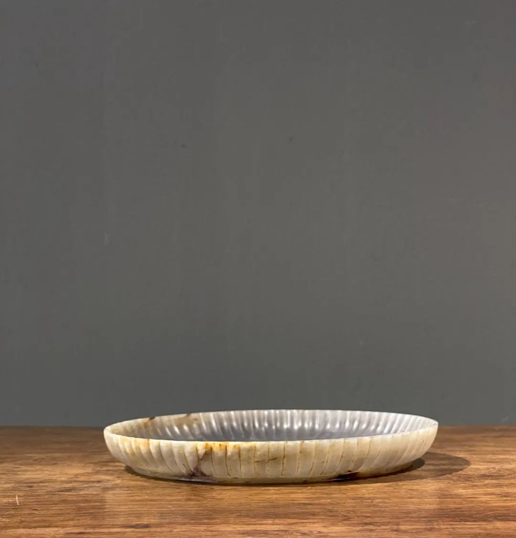 这是一件取材精良、造型设计高雅、做工精巧细腻,取材色泽灰藕色、天然纹理清晰流畅、质地半通透、坚硬明亮的玛瑙所琢磨而成的菊花式薄胎浅盘。