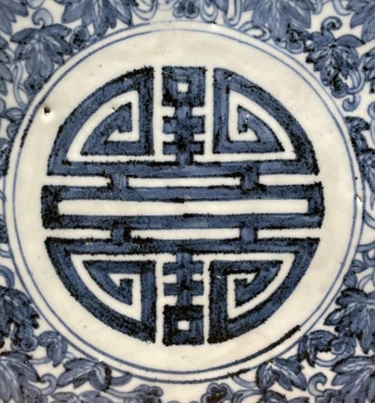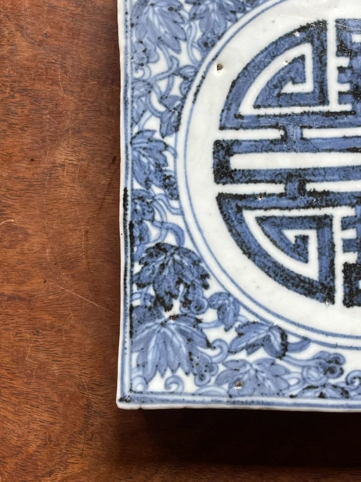如图所示,此瓜藤团寿纹青花瓷地砖除边沿小磕碰伤外,保存基本完好,具备早明青花瓷器的优雅气质,可置于书桌上摆设或加木框悬挂,风格典雅高贵。
