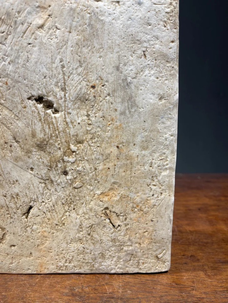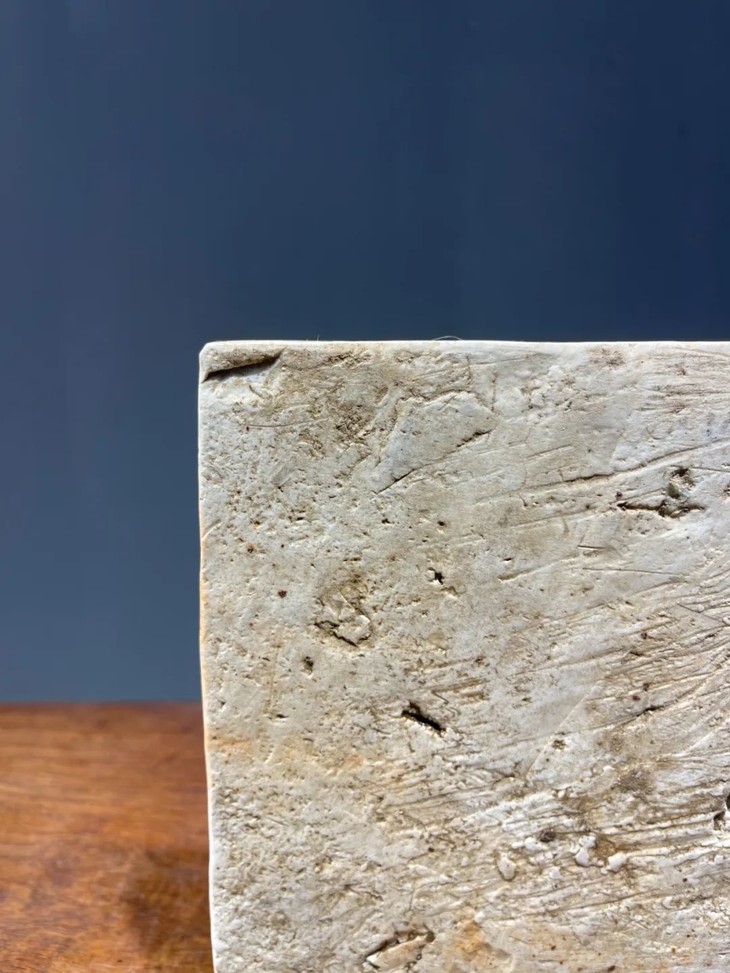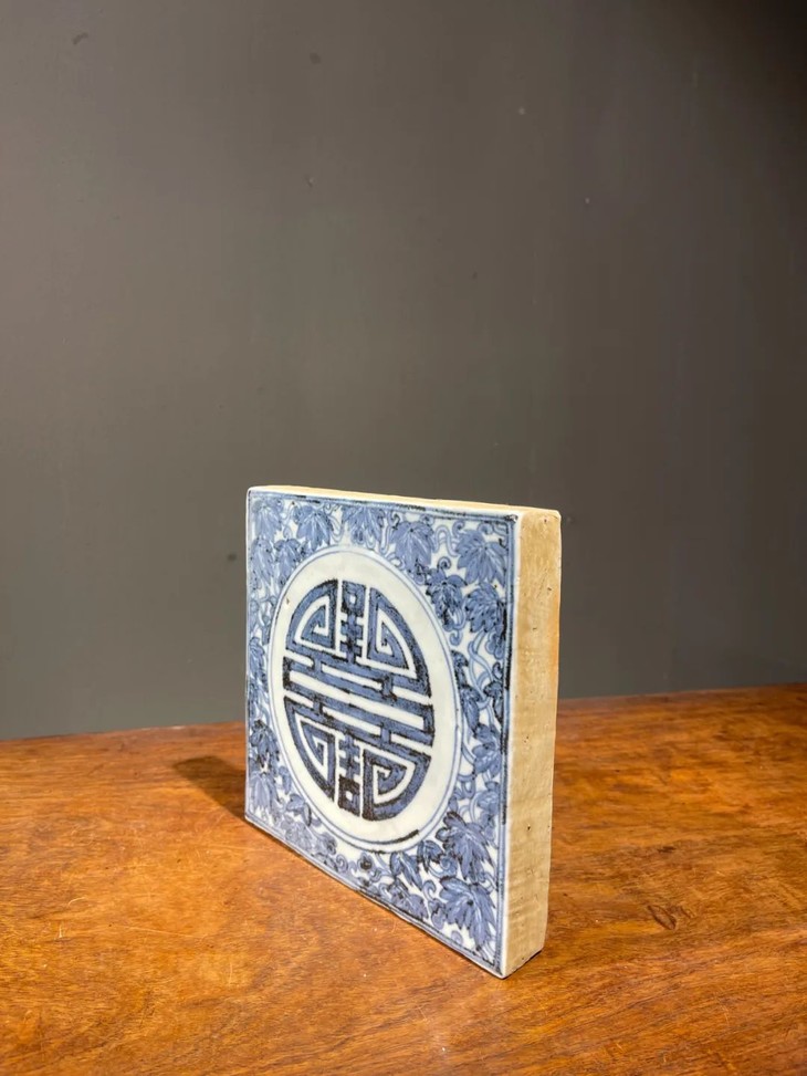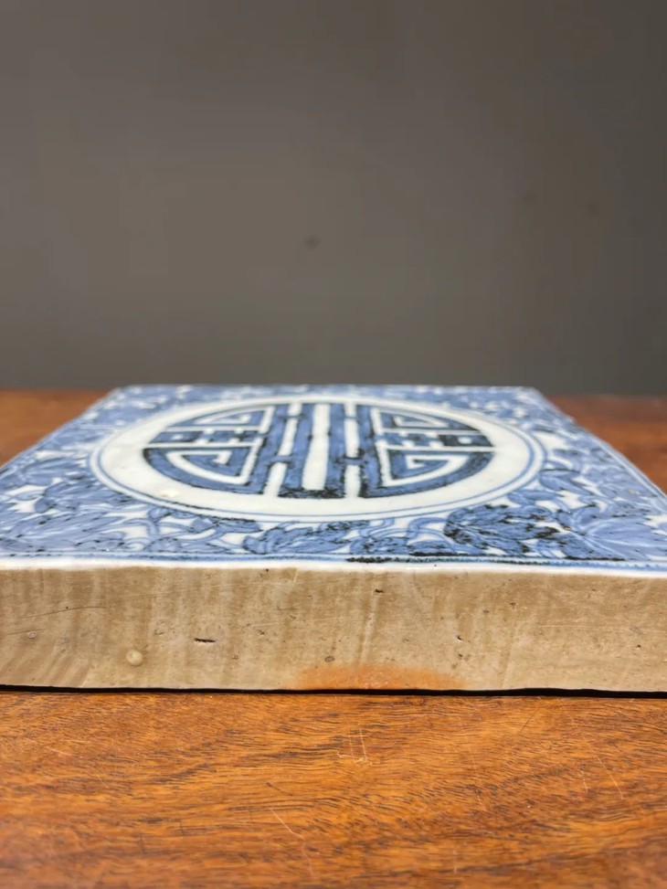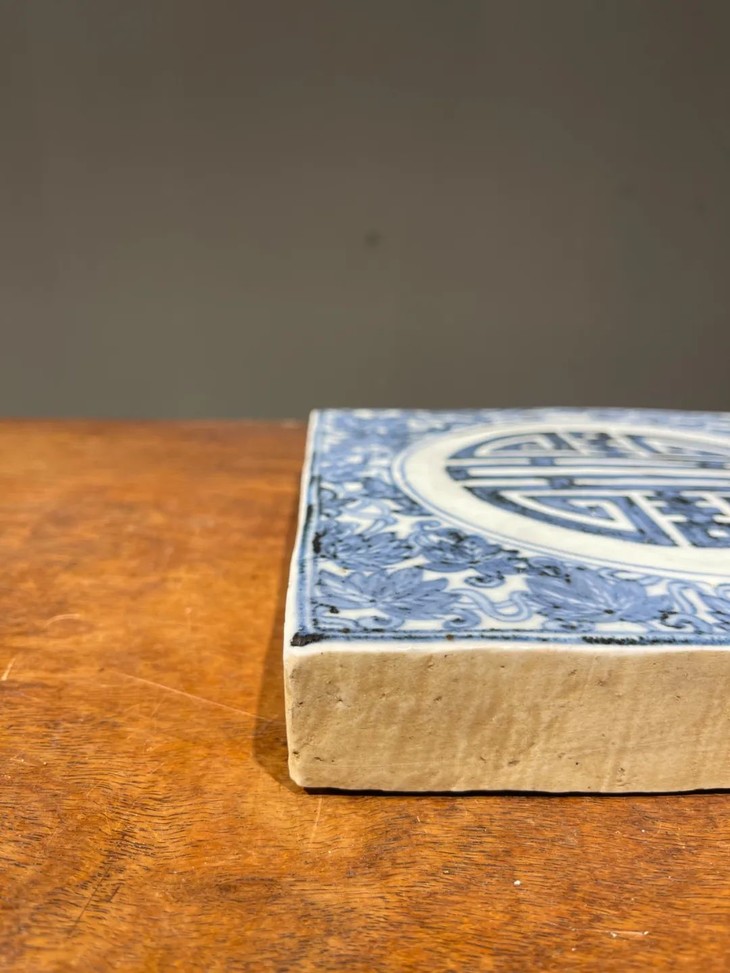 这是一件景德镇烧制的早明永乐大报恩寺地砖风格的老青花瓷地砖,高岭土细白胎的正方型厚瓷板,以进口苏麻离青钴蓝料绘与永乐时期风格的团寿字外环让瓜藤纹图案,胎质比重高,尺寸近二十厘米见方,瓷板厚度达三点二厘米,重近三公斤,釉水凝厚光润,青花发色深蓝,偶带进口青料特有的黑色斑点,四侧与底部露涩胎,呈现出洁白细密之瓷胎,体现早明永乐青花瓷器的风格与特质。