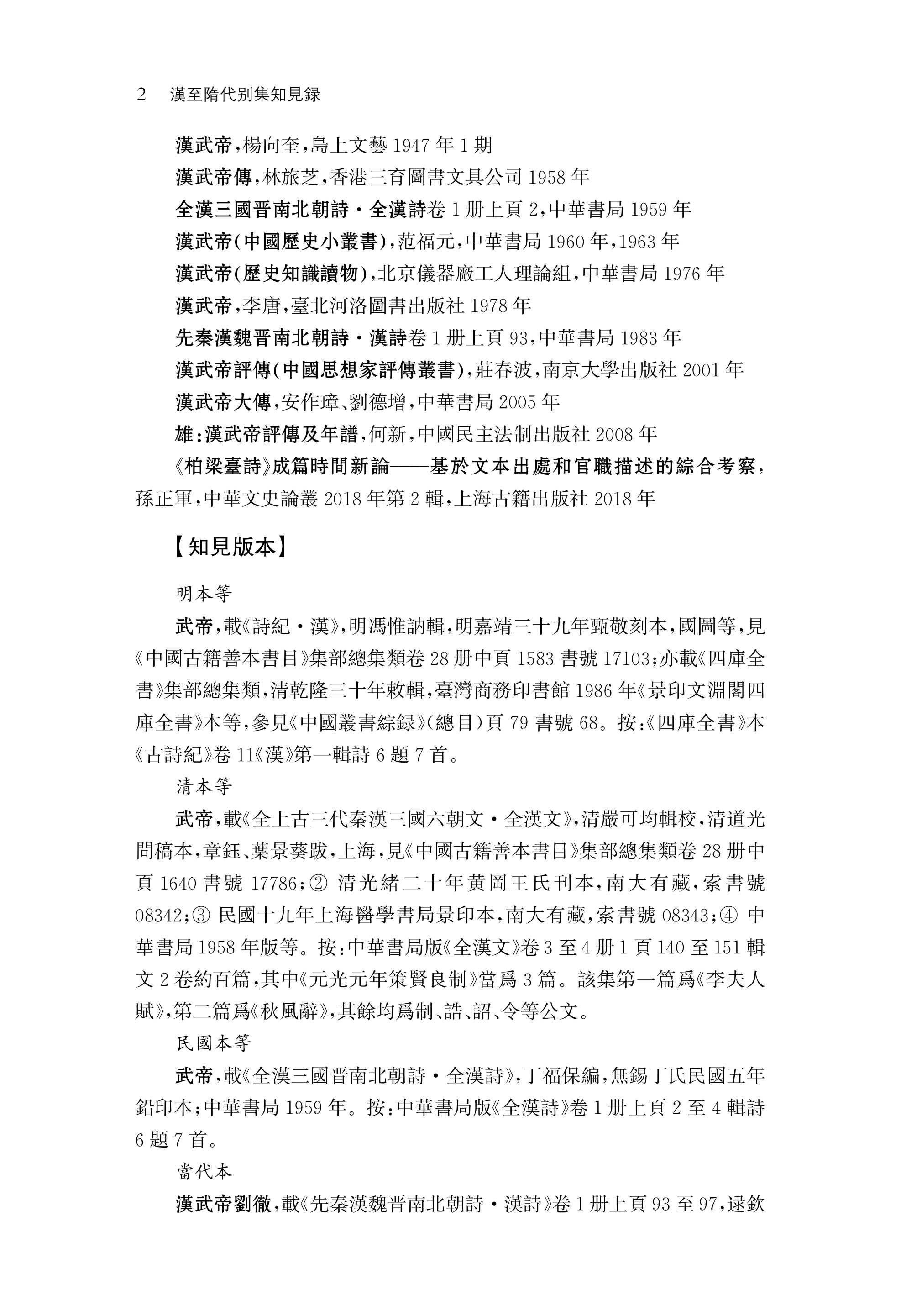 一、 本目録名爲《漢至隋代别集知見録》,旨在著録漢代至隋代現存的詩 文别集。所謂;知者,主要依據藏書目録或現代出版目録著録;所謂;見者, 主要依據所見圖書著録。凡見於著録而版本不詳,又無收藏單位者不録。
