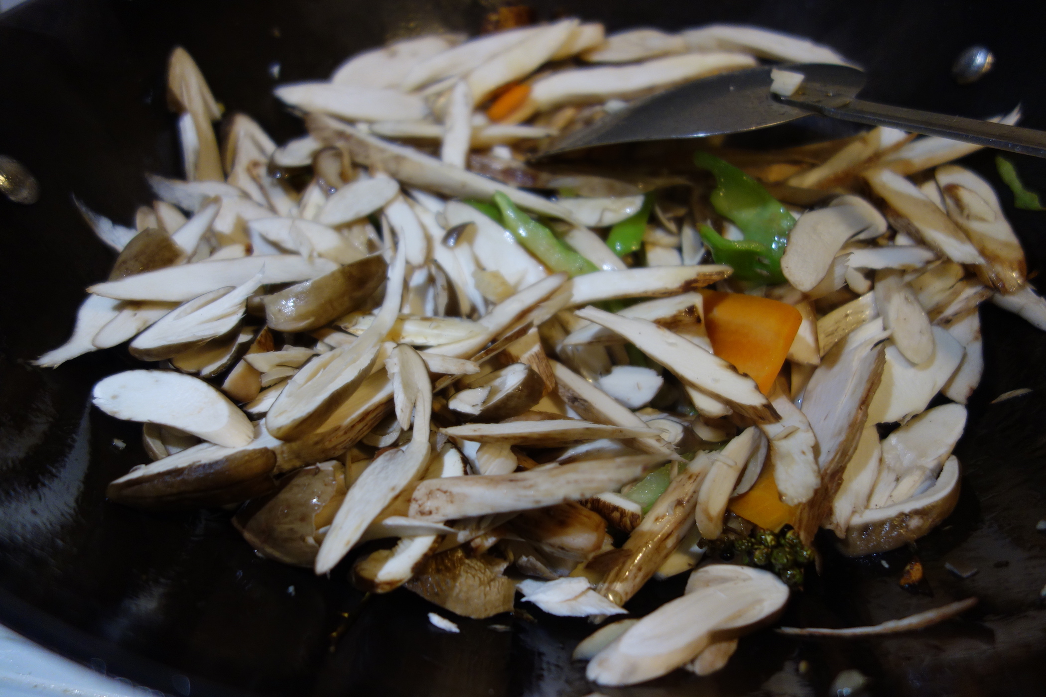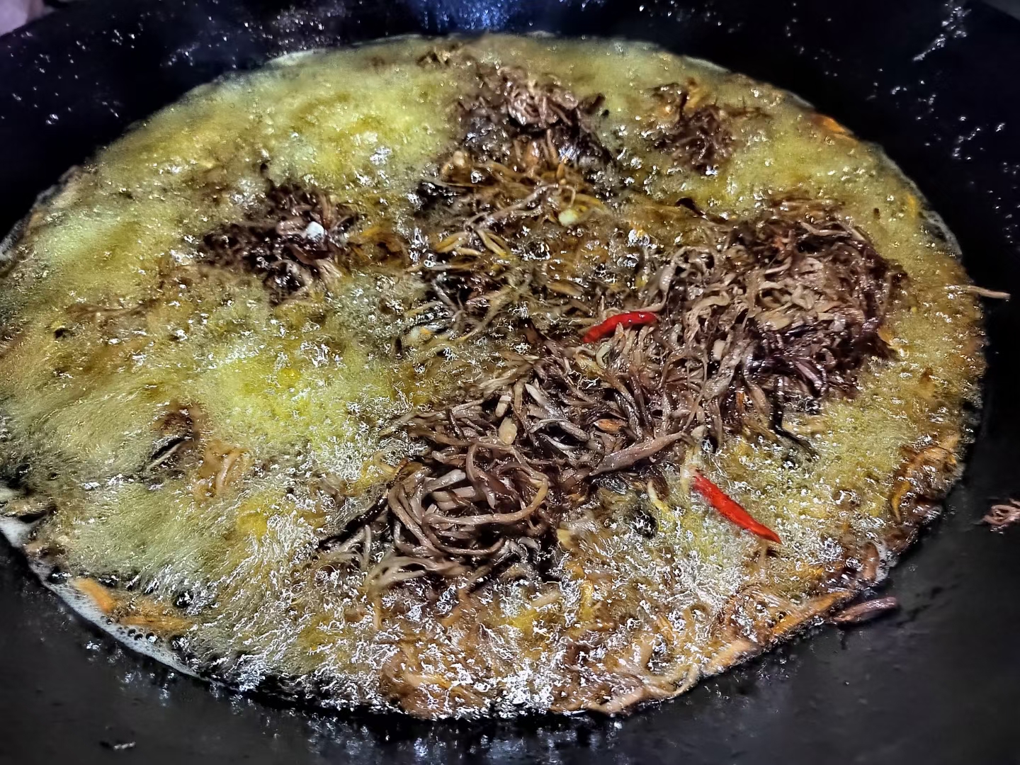 ③ 把握柴火旺度,热锅下菜籽油,待鸡枞炸至7成熟放入盐和蒜,再炸至两面金黄,水分干时放入辣椒等即可出锅放凉,准备装瓶。
