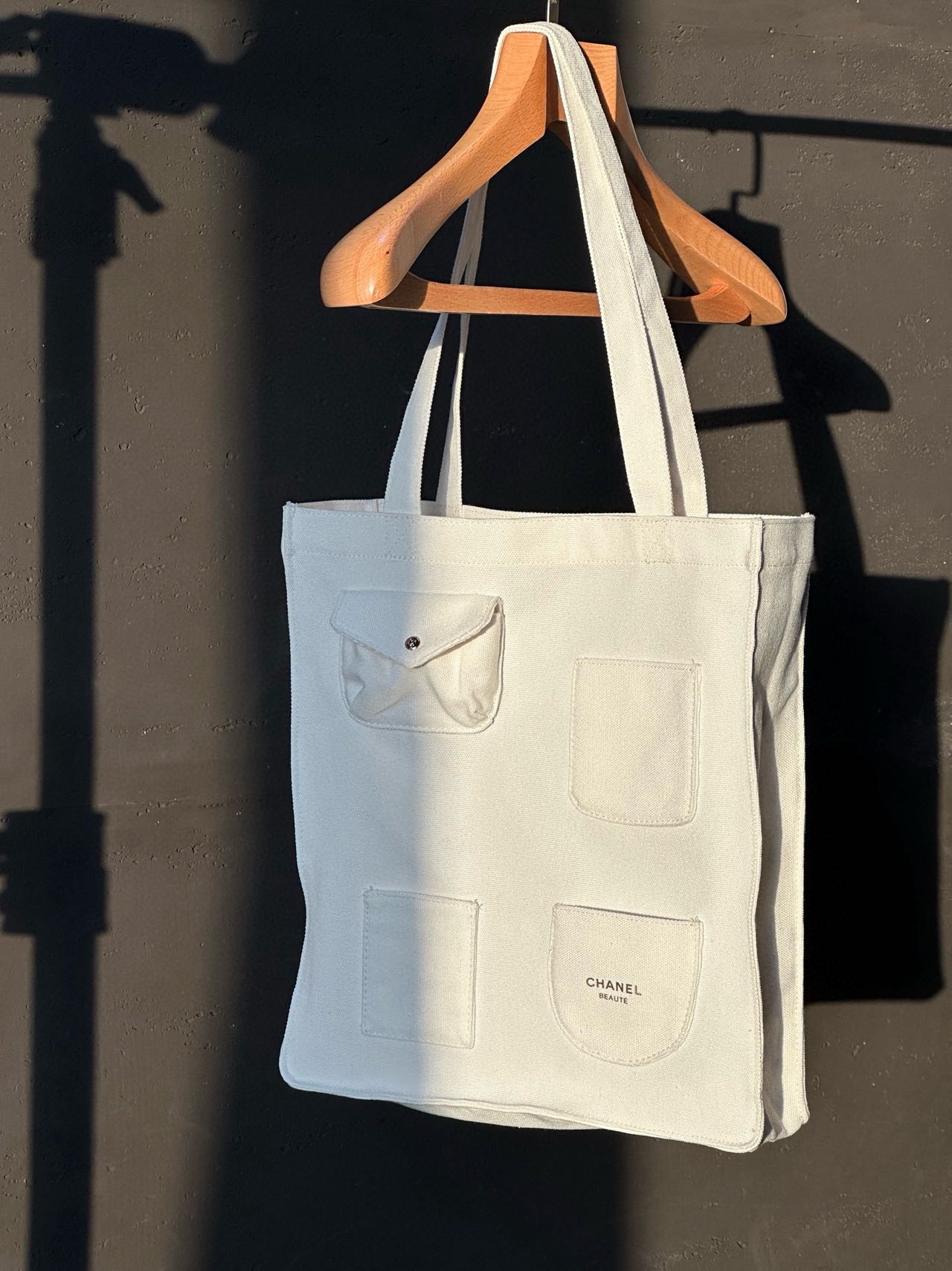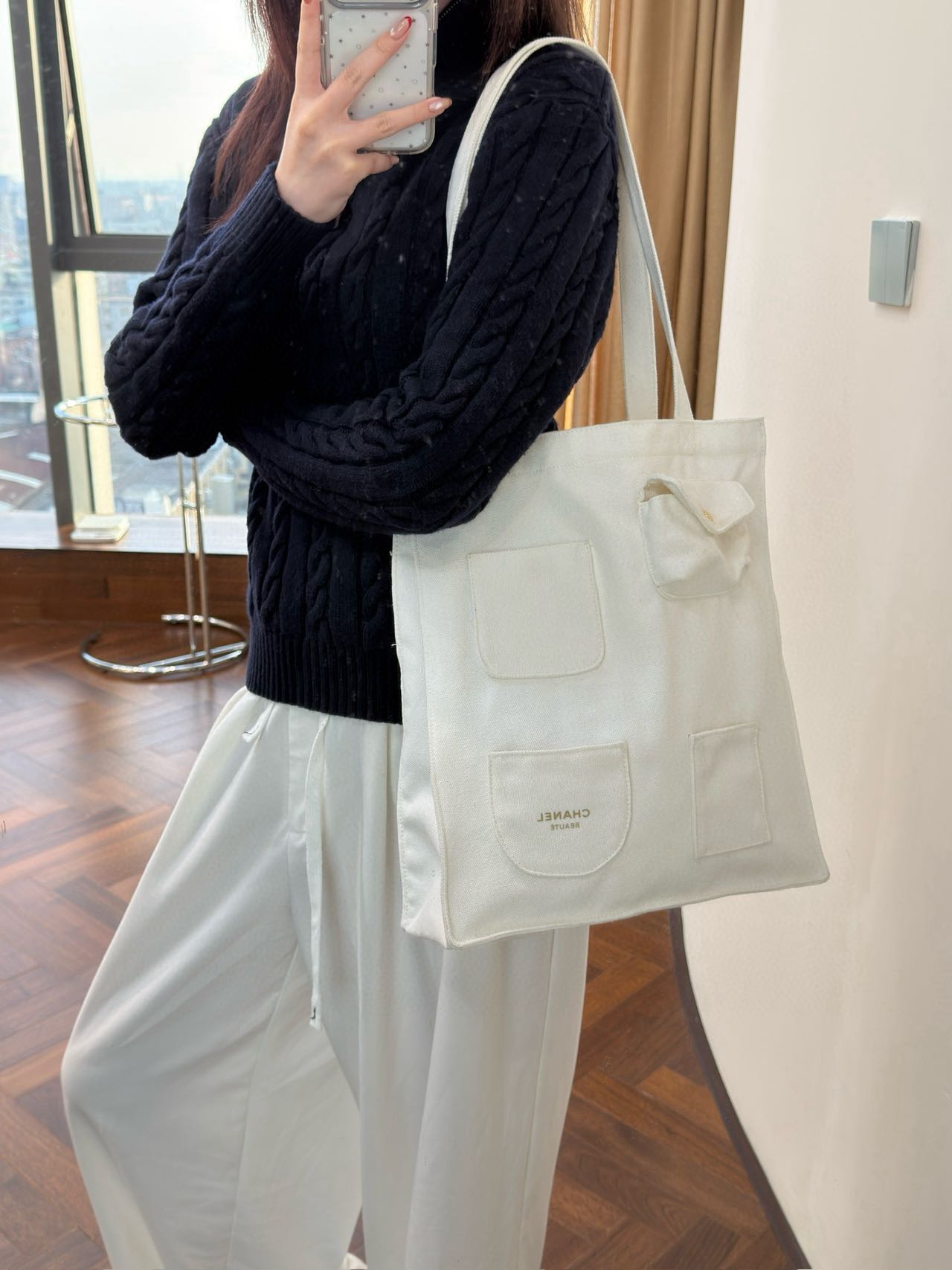 大容量单肩帆布托特包(Tote Bag),设计风格是多口袋工装风,包身有4个不同形状的贴袋,其中一个口袋带有“CHANEL”标识。