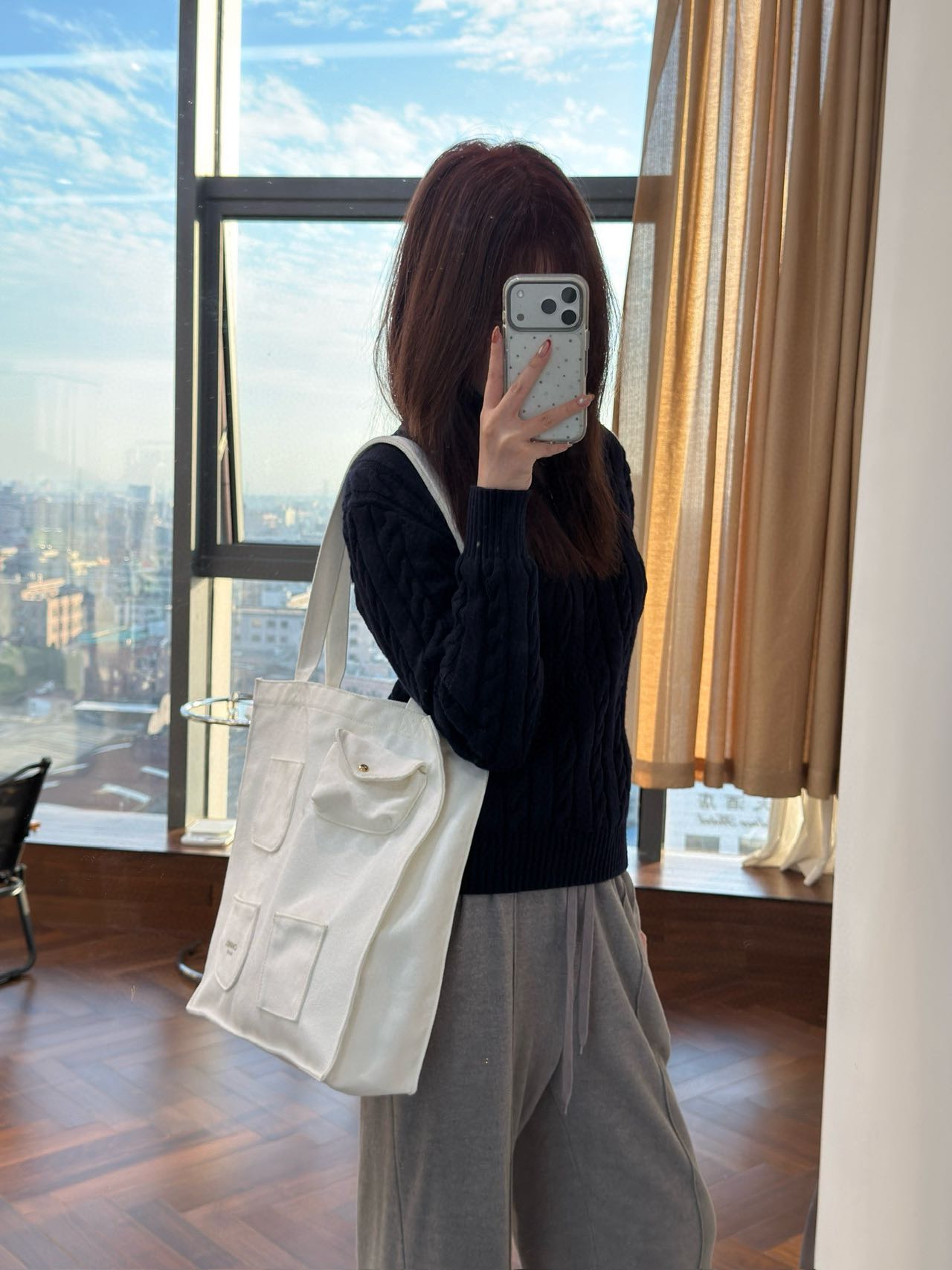 不是那种硬邦邦的架子包,是软fufu的米白色帆布,摸上去就很亲肤!整体是现在超火的工装风,包身上直接给你安排了4个口袋!乱七八糟的小东西有救啦!