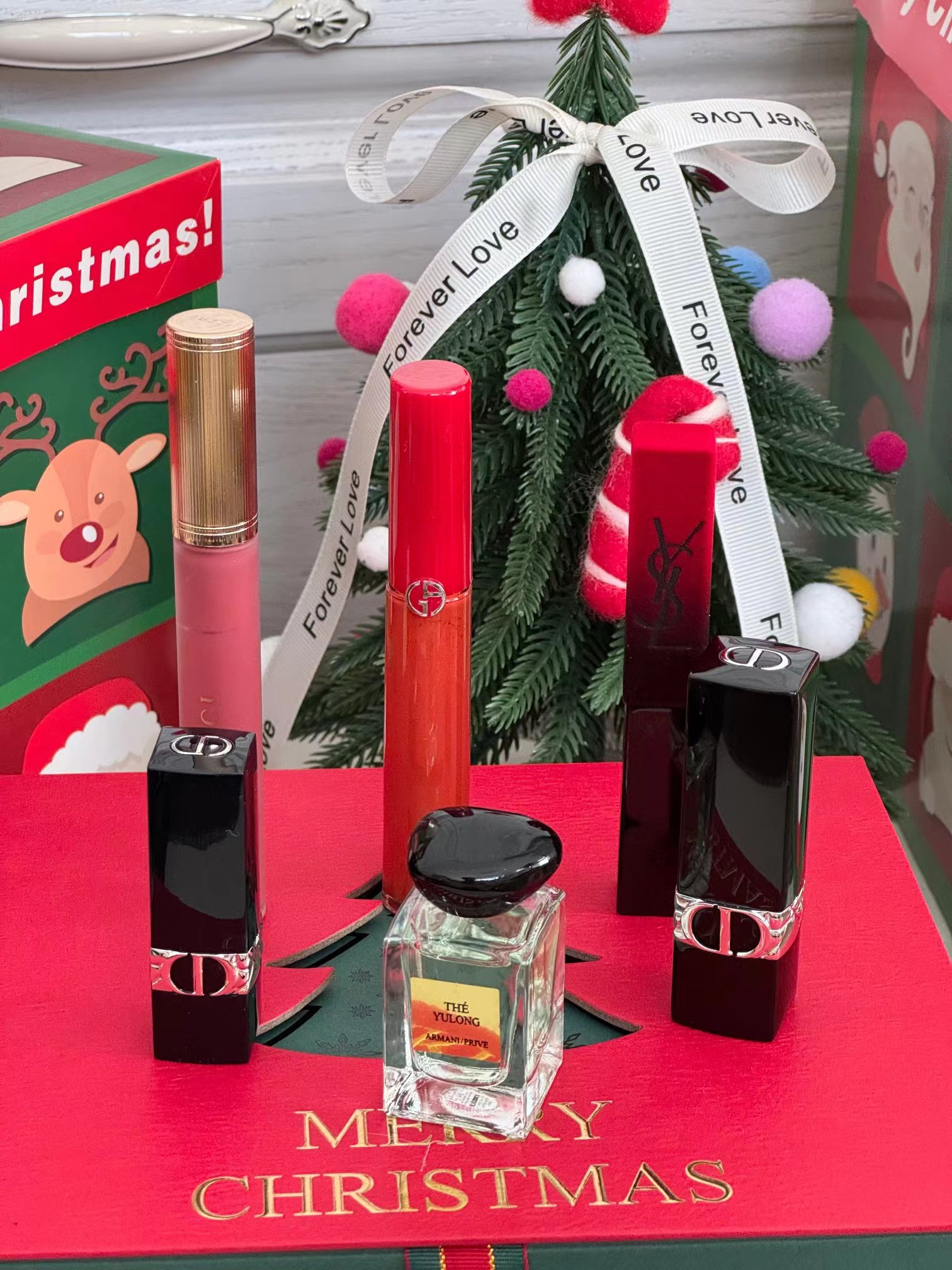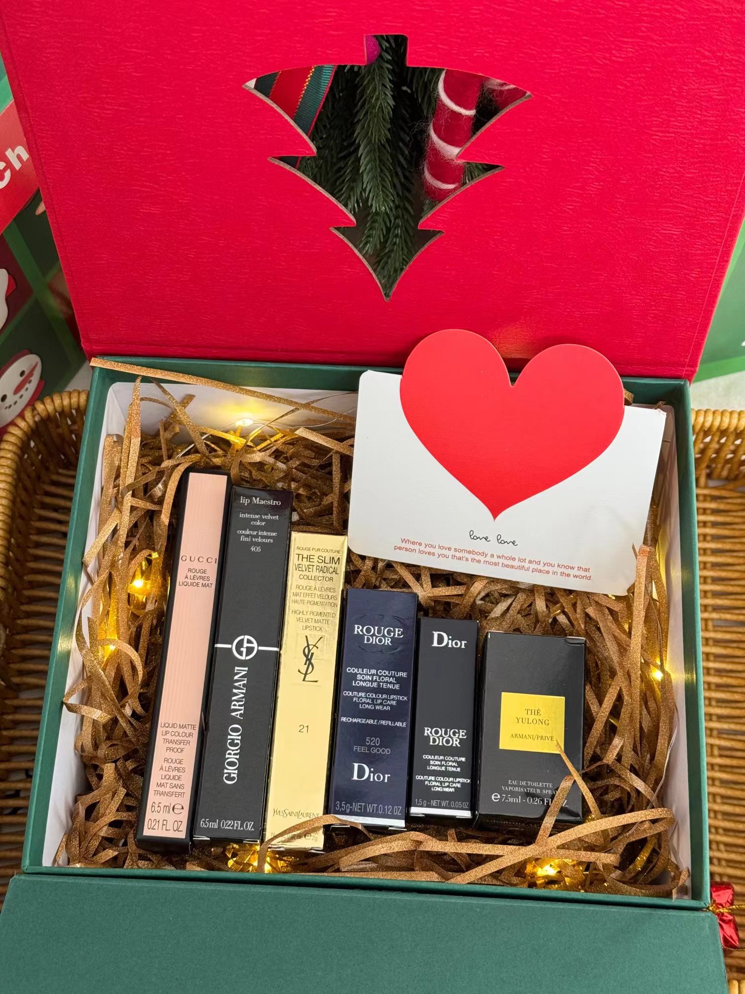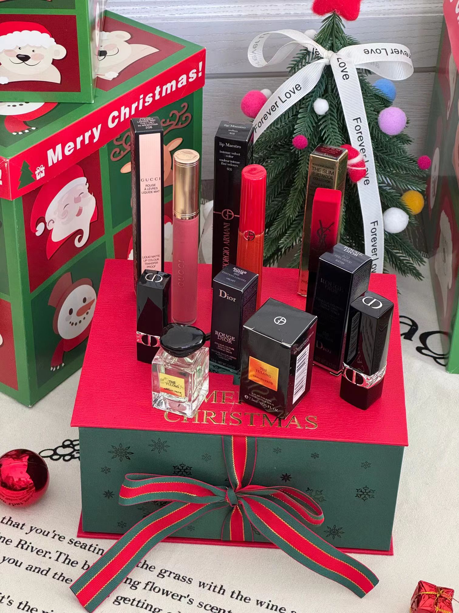 (配手提袋 打包箱)#礼物送的好叫过节,礼物送不好叫渡劫,直男务必点进来看看#【圣诞树蝴蝶丝带礼盒】内含:唇釉#203色号+唇釉#405色号+Y红丝绒口红#21色号+蓝金口红#520色号+圣诞款口红#999+玉龙茶香水小样7.5ml+贺卡+灯串+拉菲草!没有哪个女人不期待节日,在特别的日子里,挑选礼物总是费尽心思,让收到礼物的瞬间,仪式感油然而生,成为记忆中熠熠生辉的美好时刻~满满的礼物仪式感,有哪个小姐姐能抗拒呢?货品实拍 口红膏体放大拍摄???品质放心??放心购这份精心搭配的礼盒,装满了宠爱与用心,开盖即是惊艳!礼物很小,但‘爱你’这件事,很大!!送人大气,自用超值,炒鸡体面!逆T礼盒,闭眼抢!就一批十来盒,抢到就是赚到!