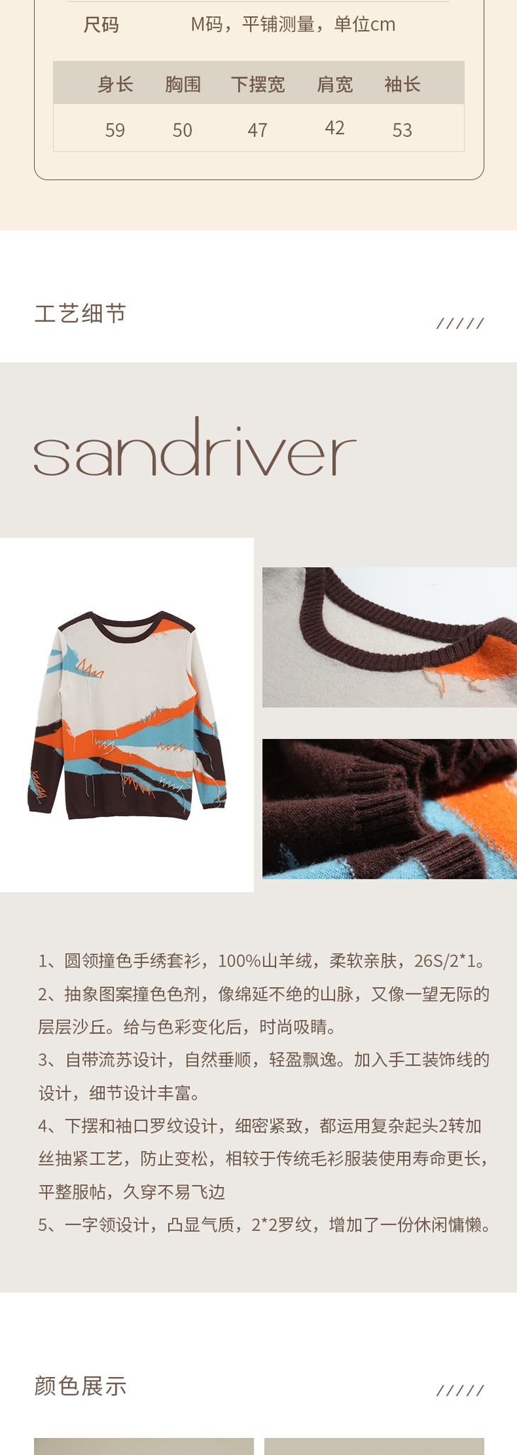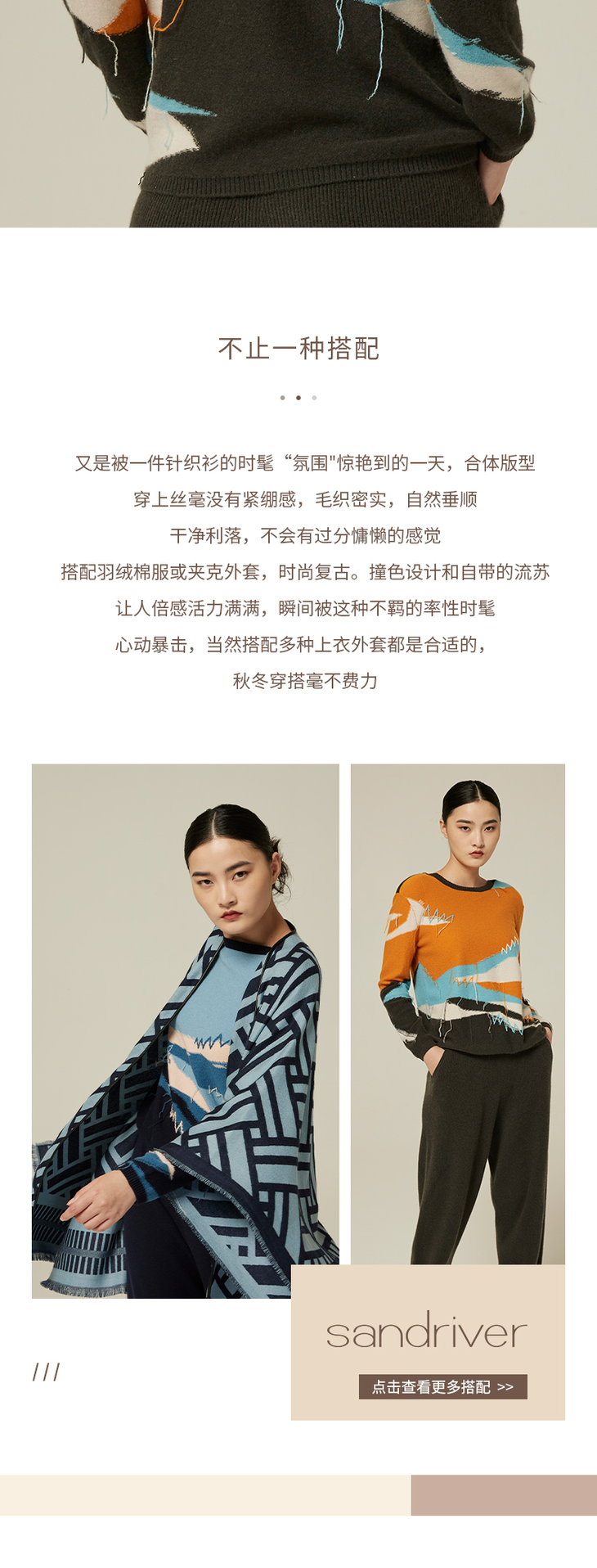 历年在巴黎时装周亮相,享誉世界的艺术羊绒品牌[Sandriver 沙涓]由羊绒布道者郭秀玲女士创立。阿拉善自有牧场纯种羔羊绒,日本国宝设计师小筱顺子,上海自有基地精工细作。承载羊绒情怀,坚持匠人品质。
