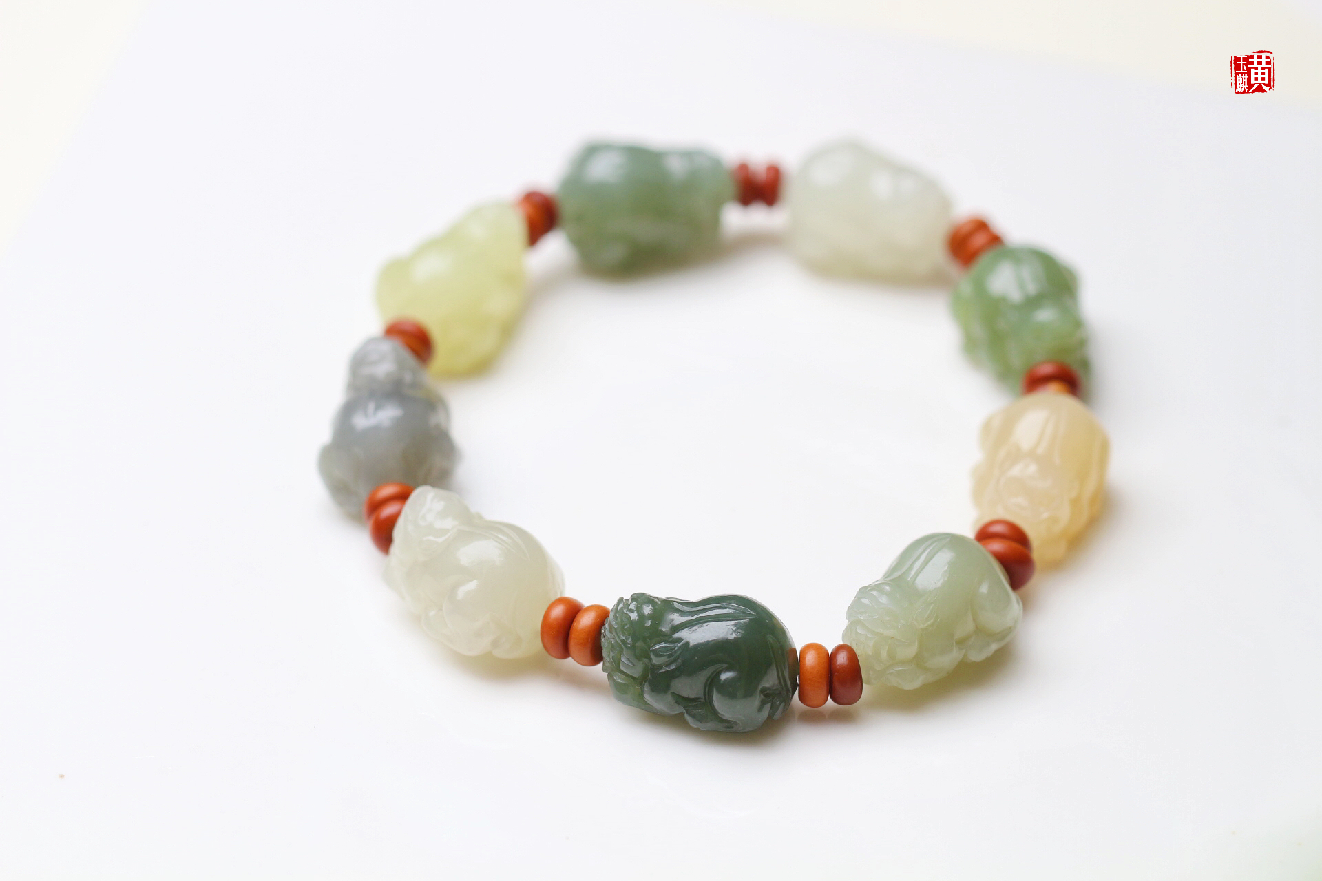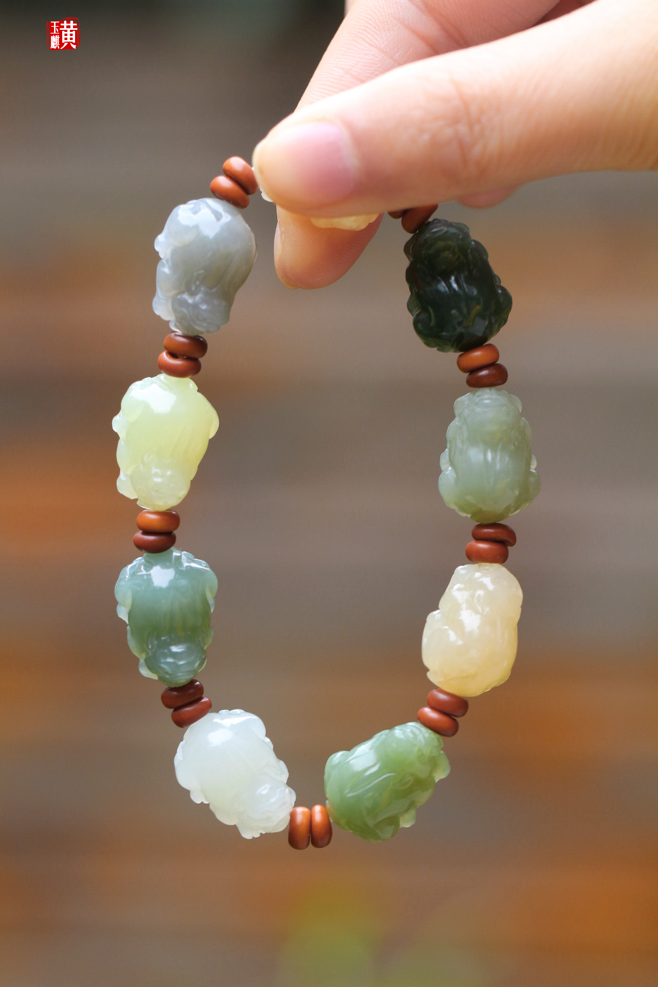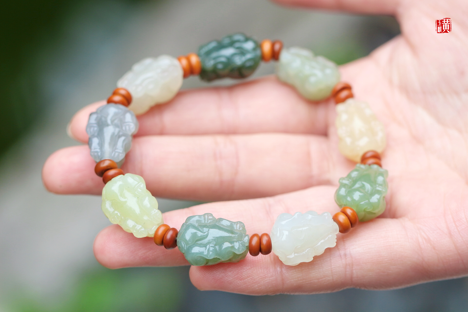 (九只玉貔貅分别由和田玉中的白玉、黄玉、藕粉玉、青玉、烟紫玉、晴水玉、且末蓝玉等雕刻而成)