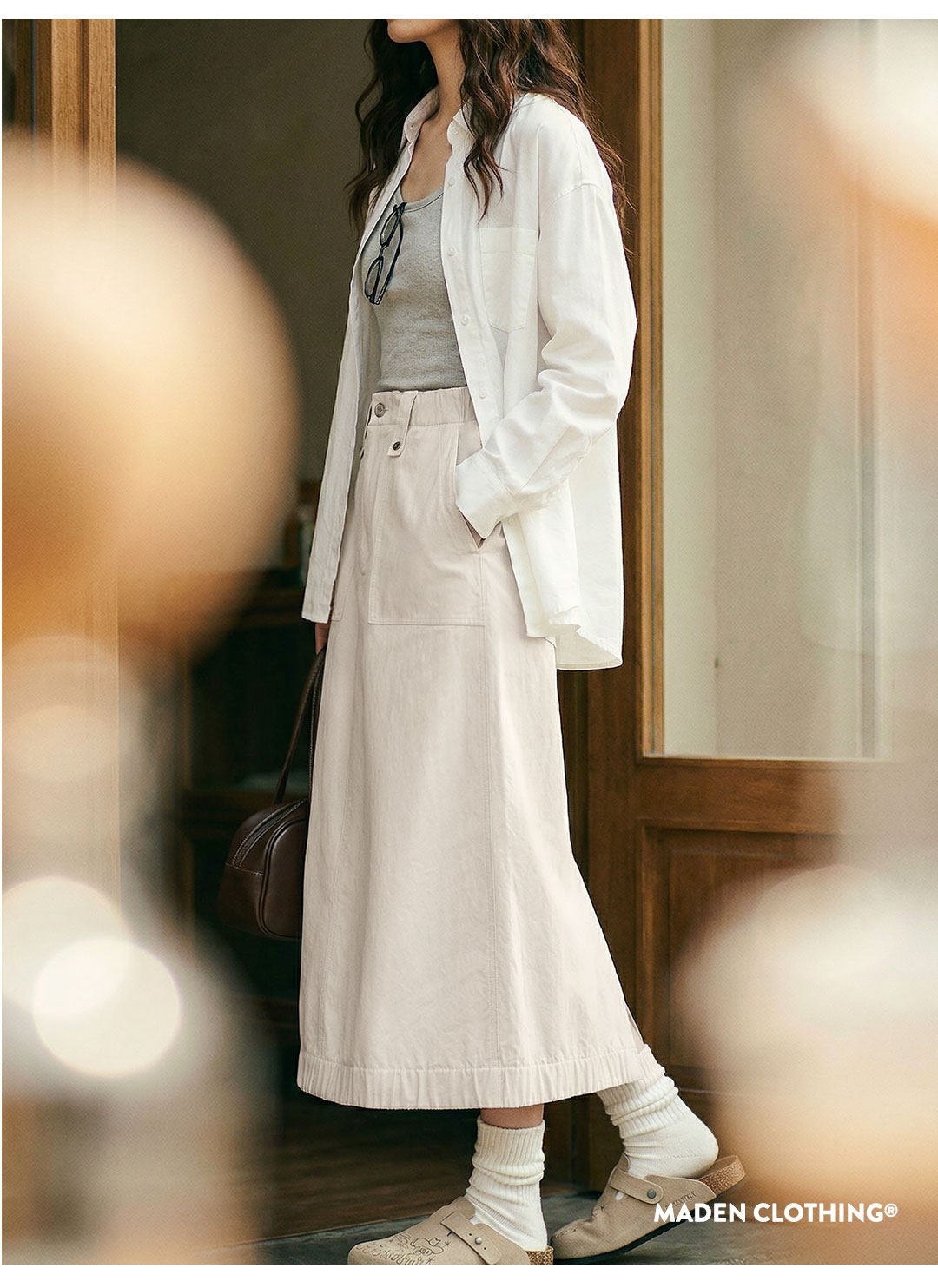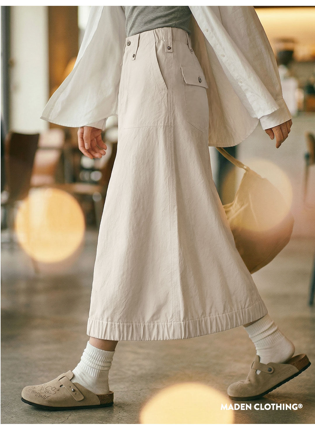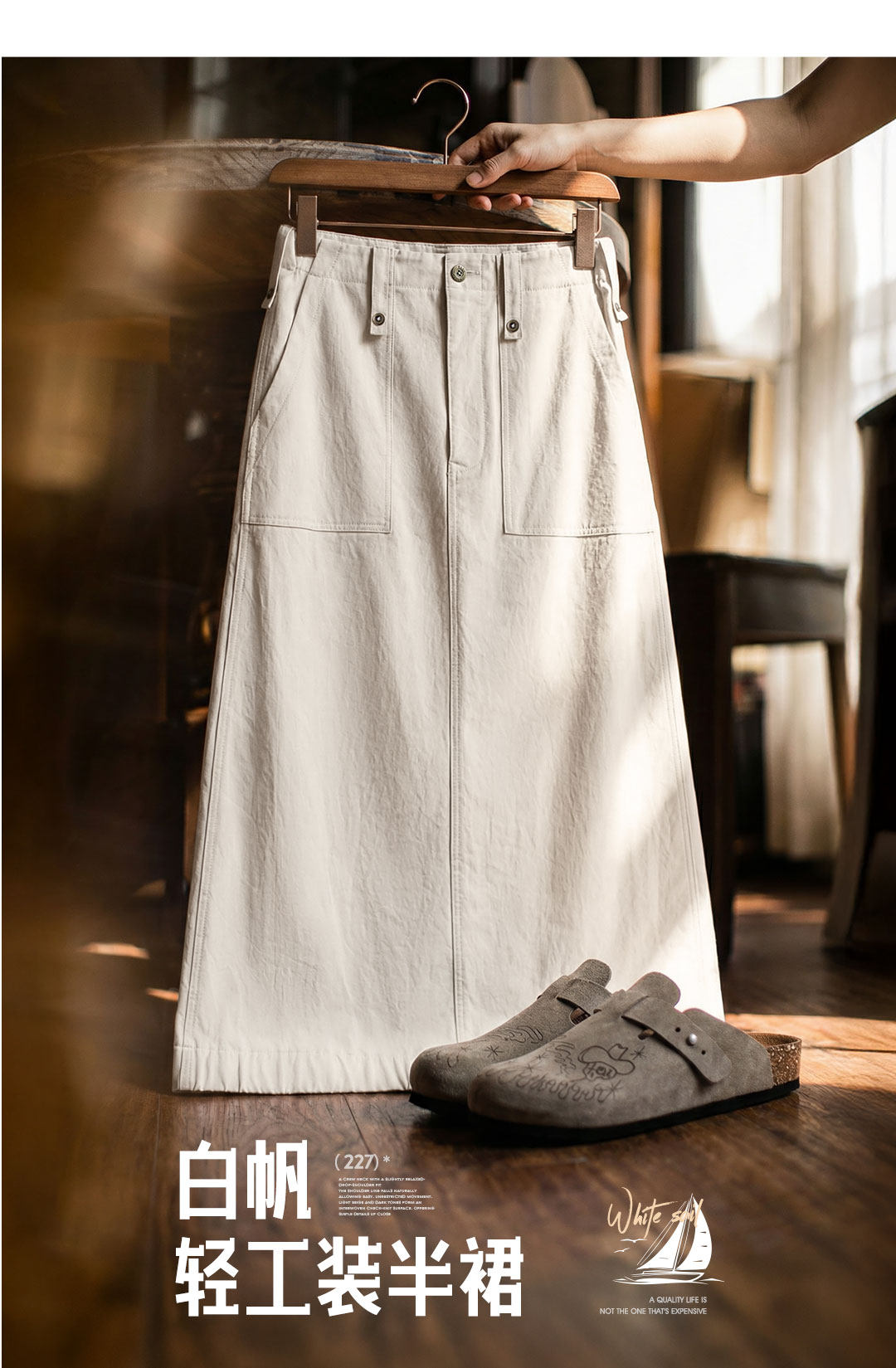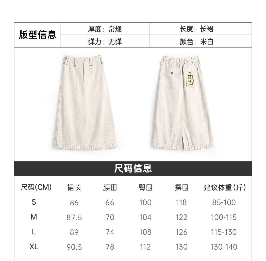 马登复古米白色高腰垂感显瘦休闲A字版后开叉直筒工装半身裙女士