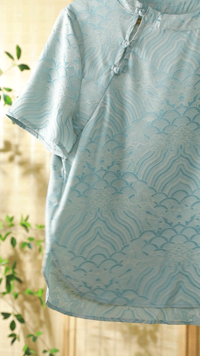 这是一款中式短袖上衣,取古风之韵,融今时之简,斜襟错落,盘扣点缀,如诗般流淌着东方的优雅。
