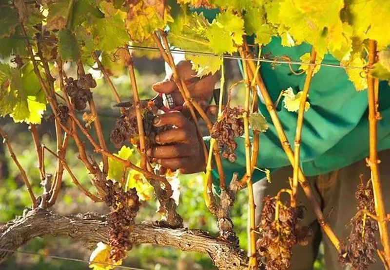 芳蒂娜生长周期长,成熟度高。成熟之后不采摘,葡萄挂在藤上自然风干,浆果在转变成葡萄干之前,根据成熟度选择适当的时机进行分区采摘,因此他们能够生产出具有非常高浓缩的康斯坦斯天然甜白葡萄酒。