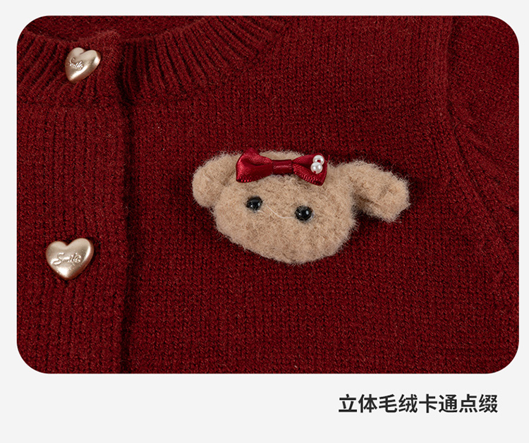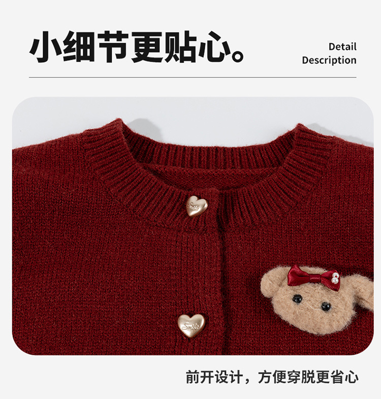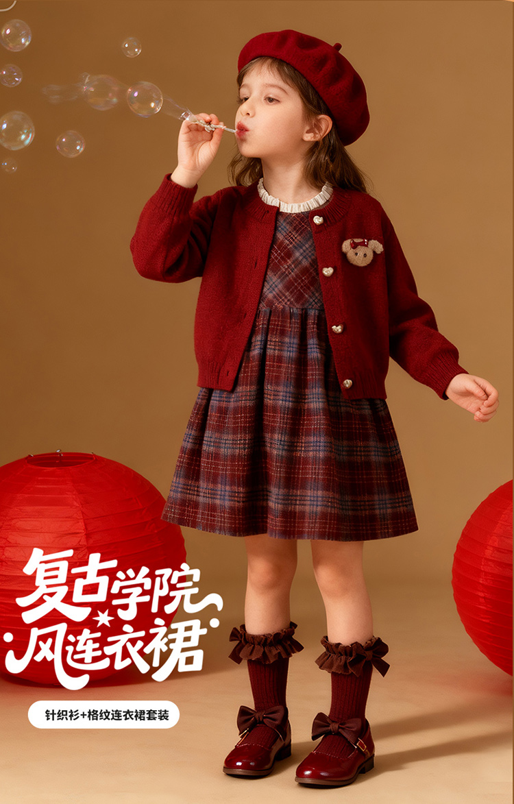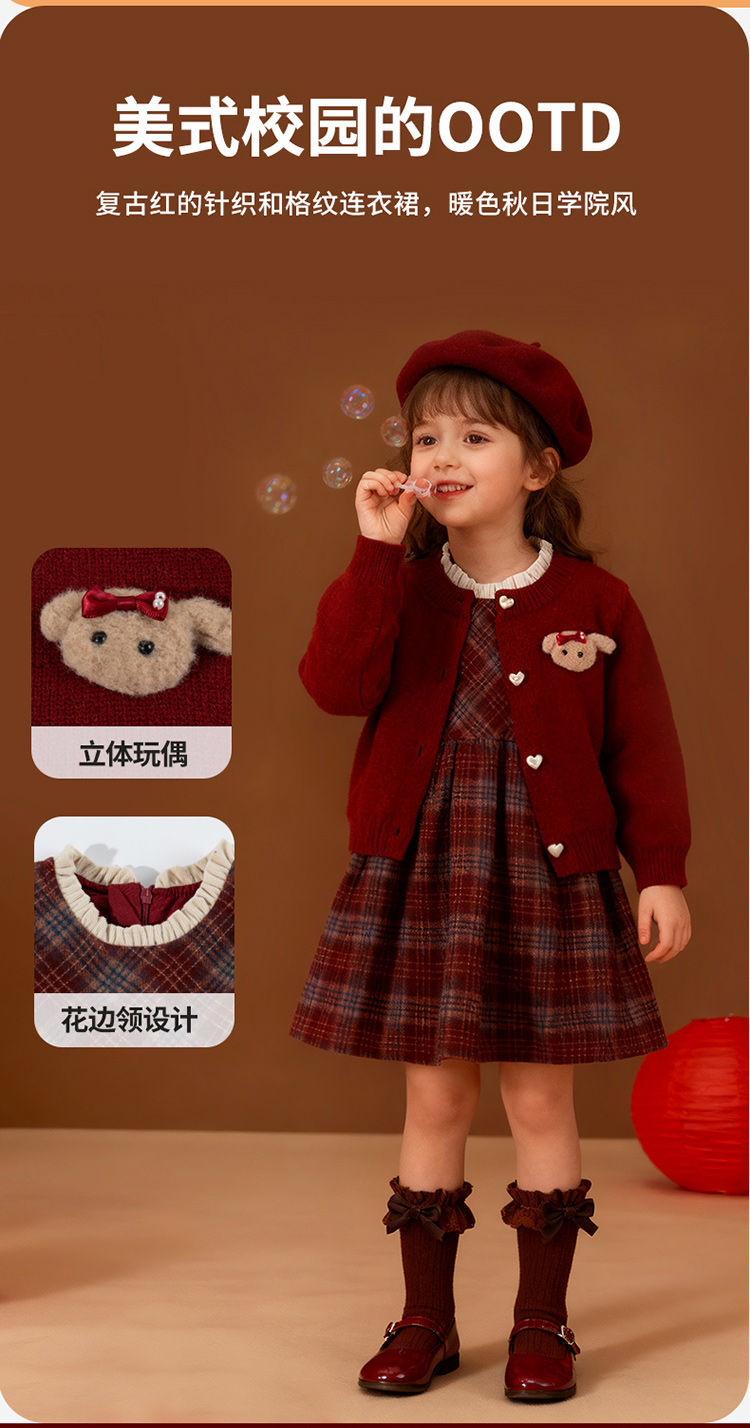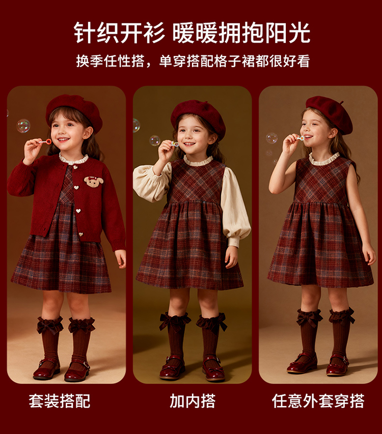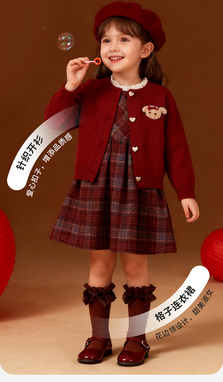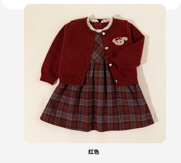 贝贝怡复古格纹连衣裙+开衫毛衣套装秋冬新款女童甜美连体衣裙两件套ZB3EQ003