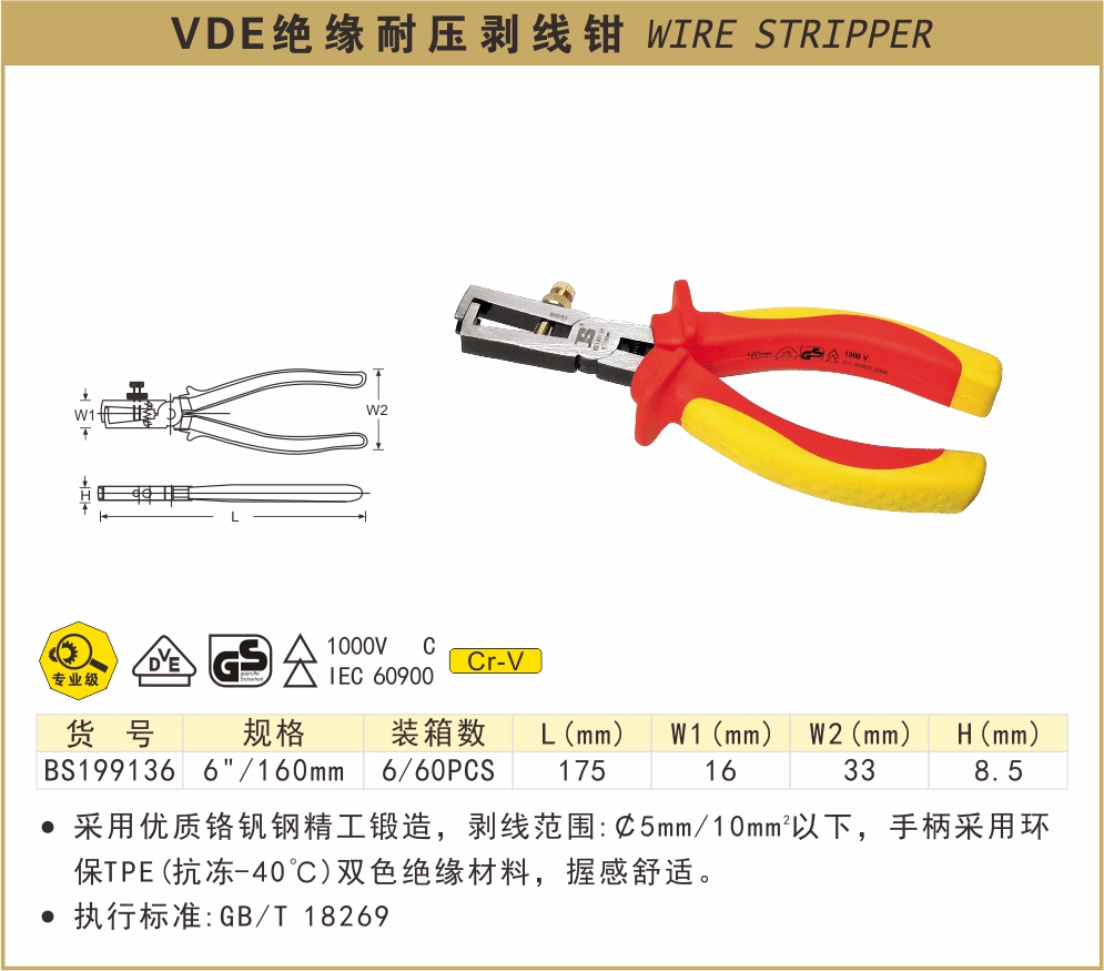 波斯VDE绝缘耐压剥线钳6寸 BS199136