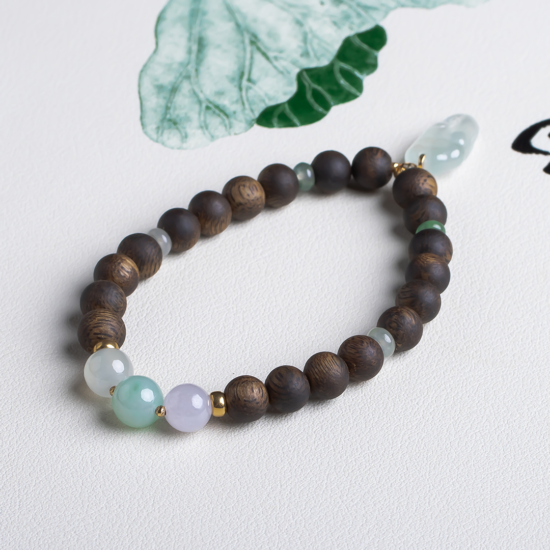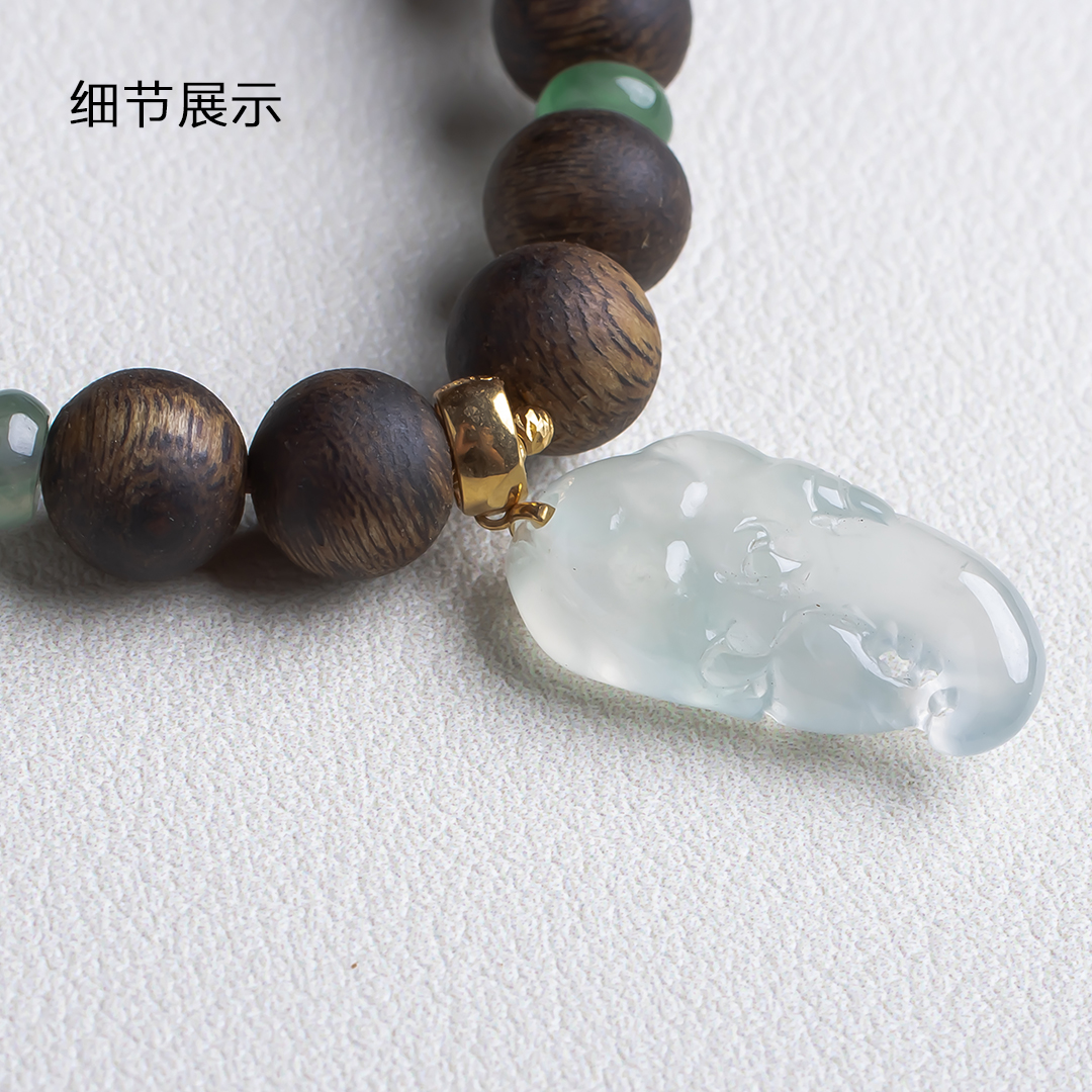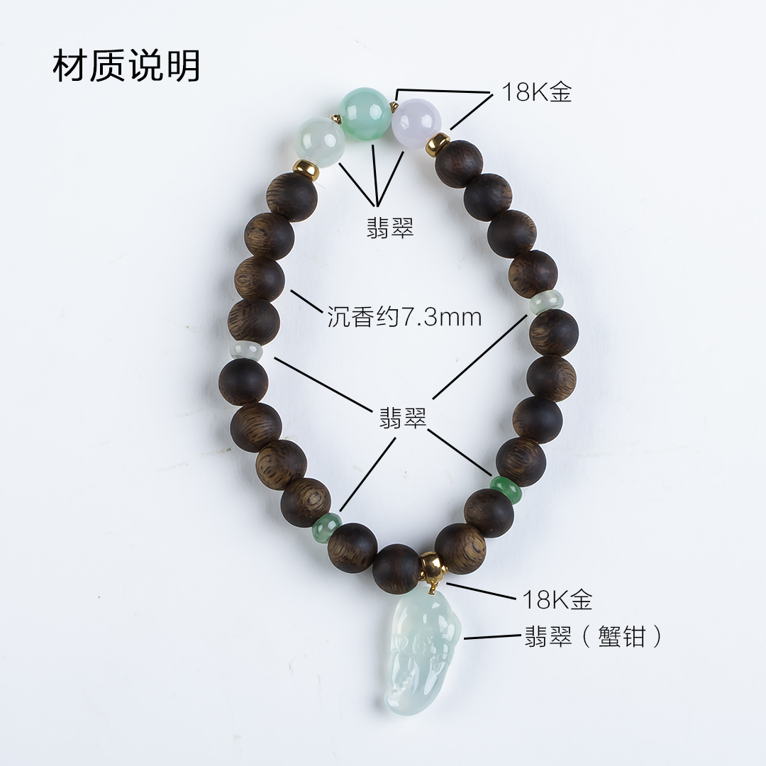 xy0477沉香+翡翠蟹钳手串.金,天然沉香约7.3mm,原色原味,香味自然清甜,三颗冰底翡翠+一枚冰种翡翠蟹钳,还有四枚冰种翡翠隔珠,款式优雅时尚,玉质盈润,18K金搭配,富贵有钳(钱)。