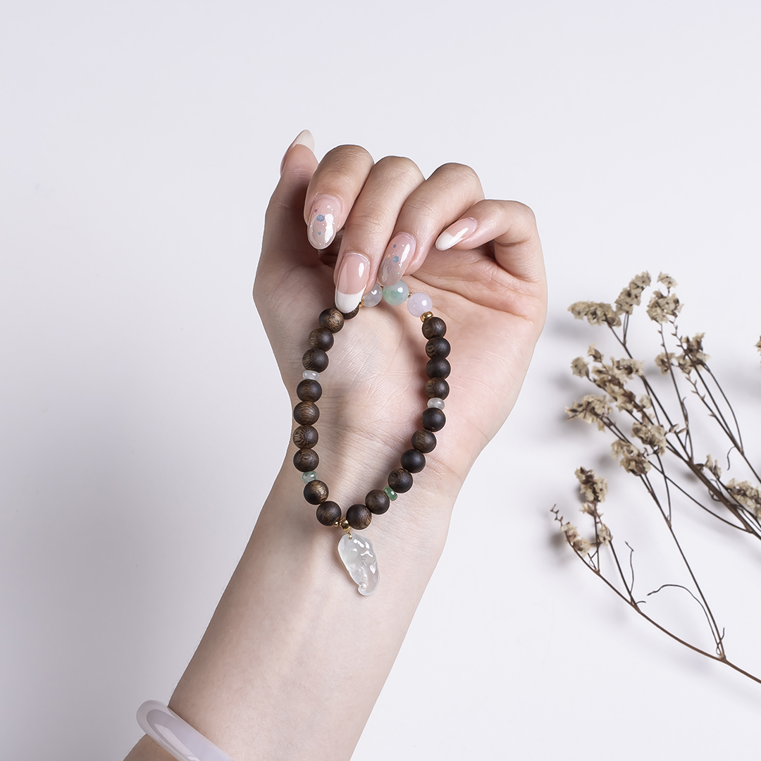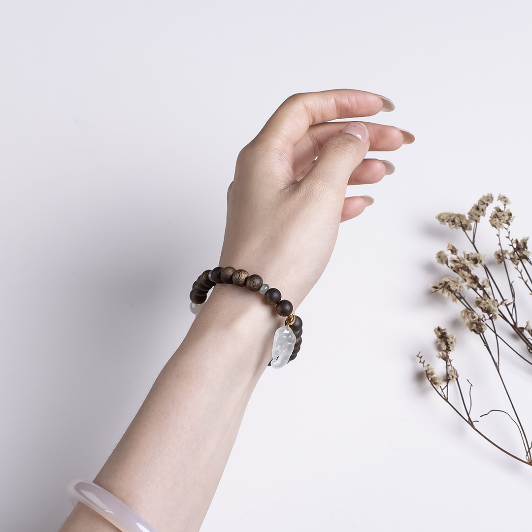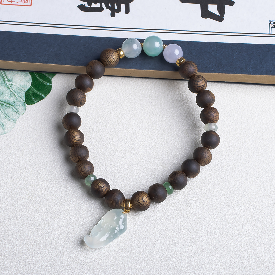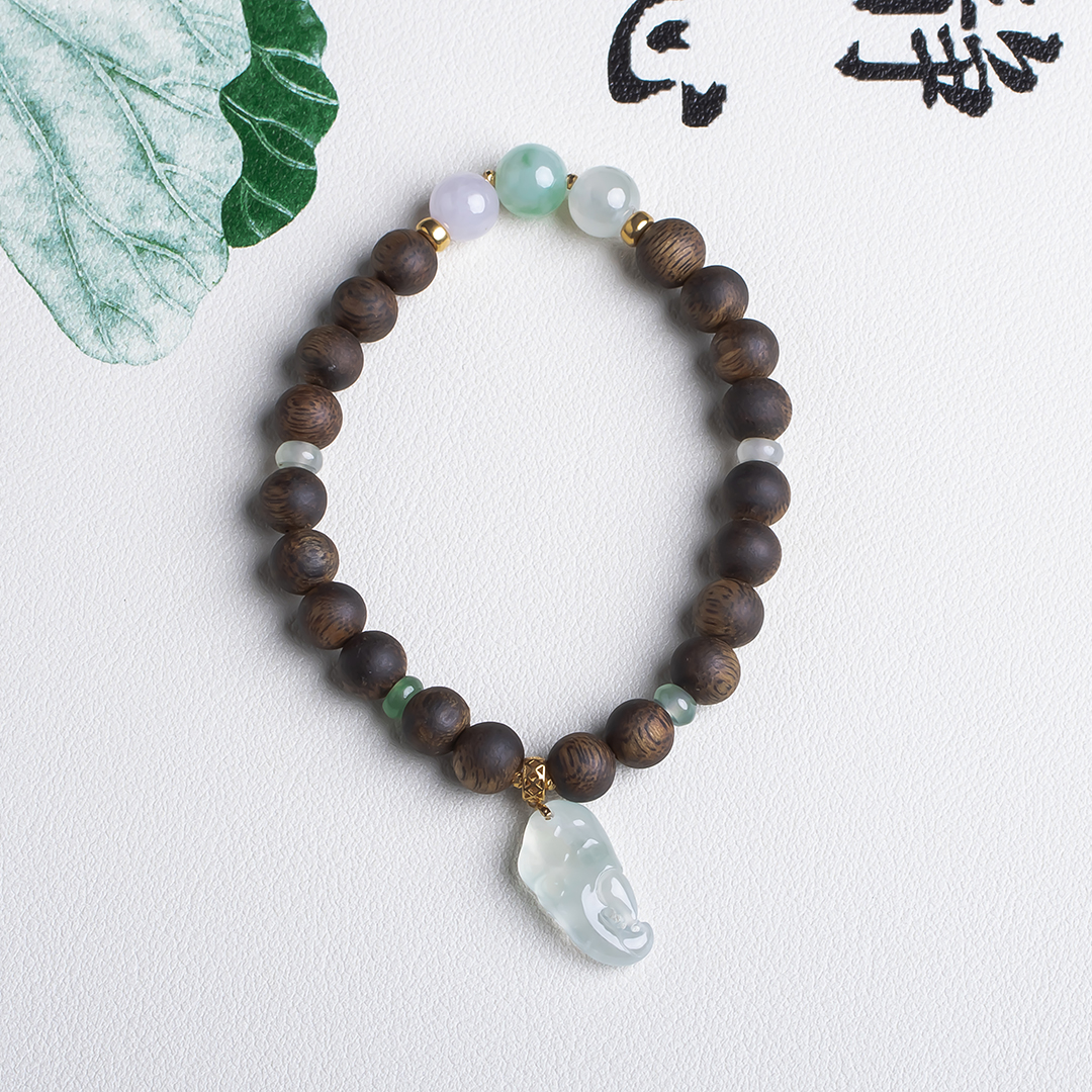 xy0477沉香+翡翠蟹钳手串.金,天然沉香约7.3mm,原色原味,香味自然清甜,三颗冰底翡翠+一枚冰种翡翠蟹钳,还有四枚冰种翡翠隔珠,款式优雅时尚,玉质盈润,18K金搭配,富贵有钳(钱)。