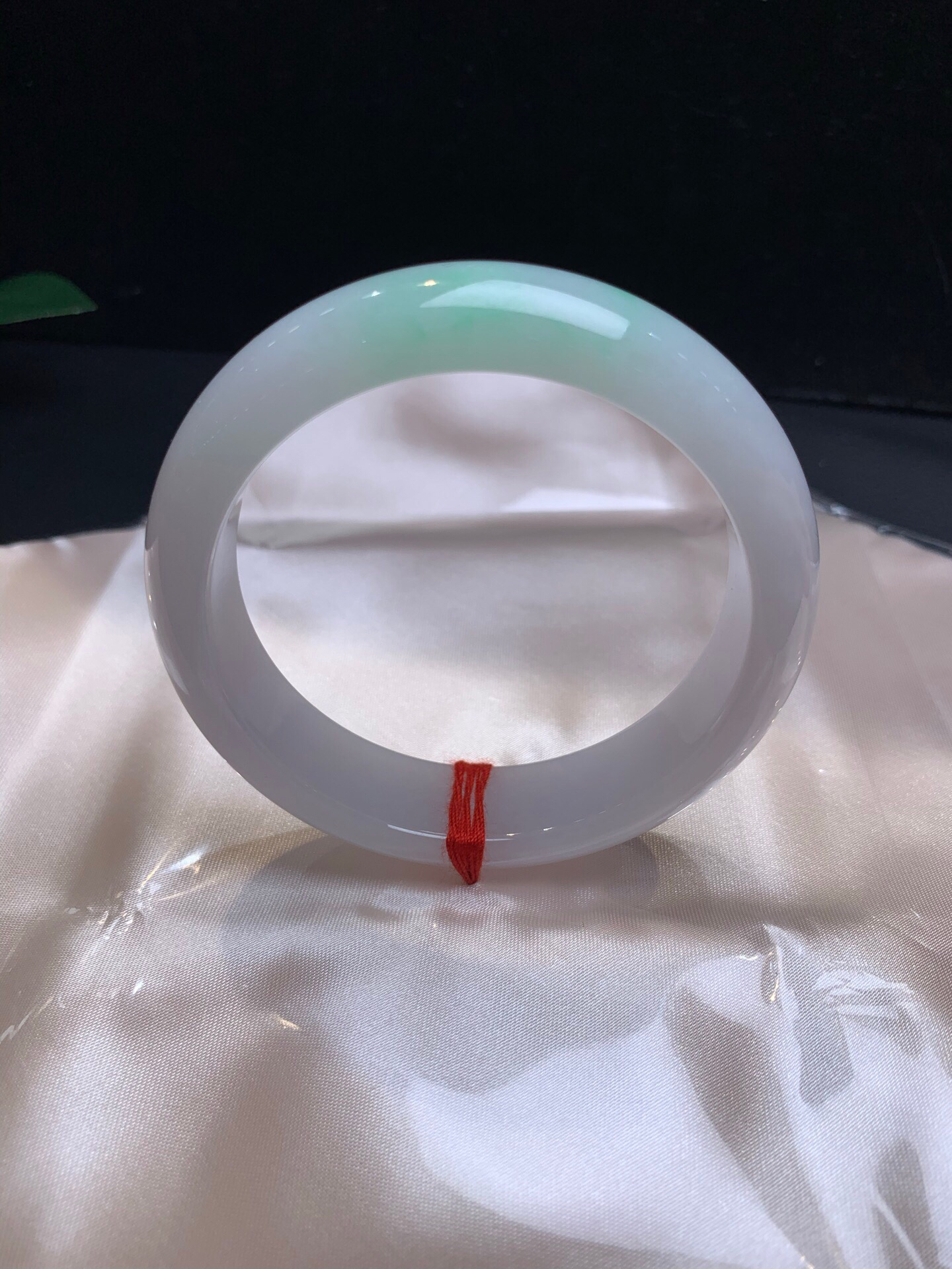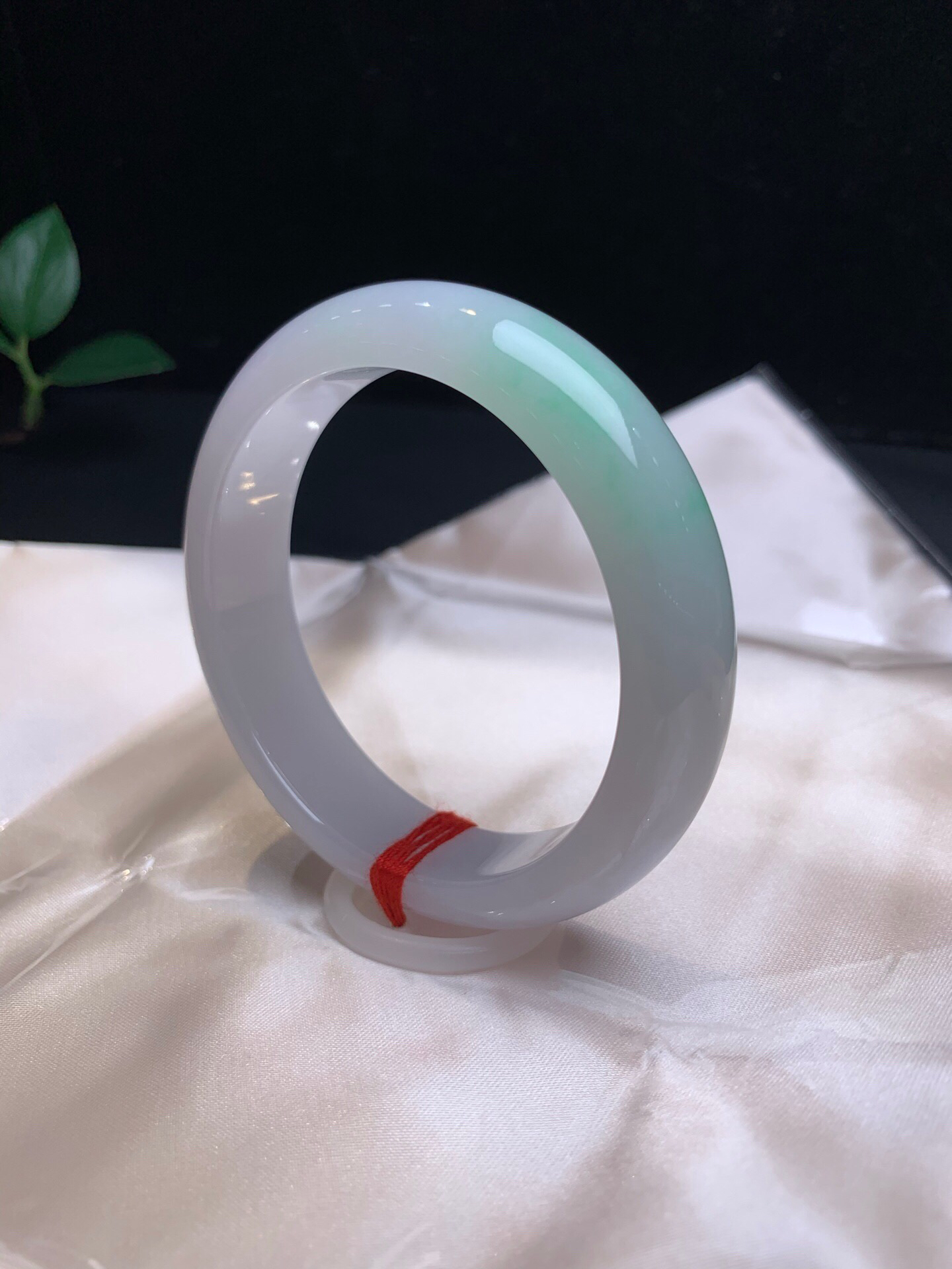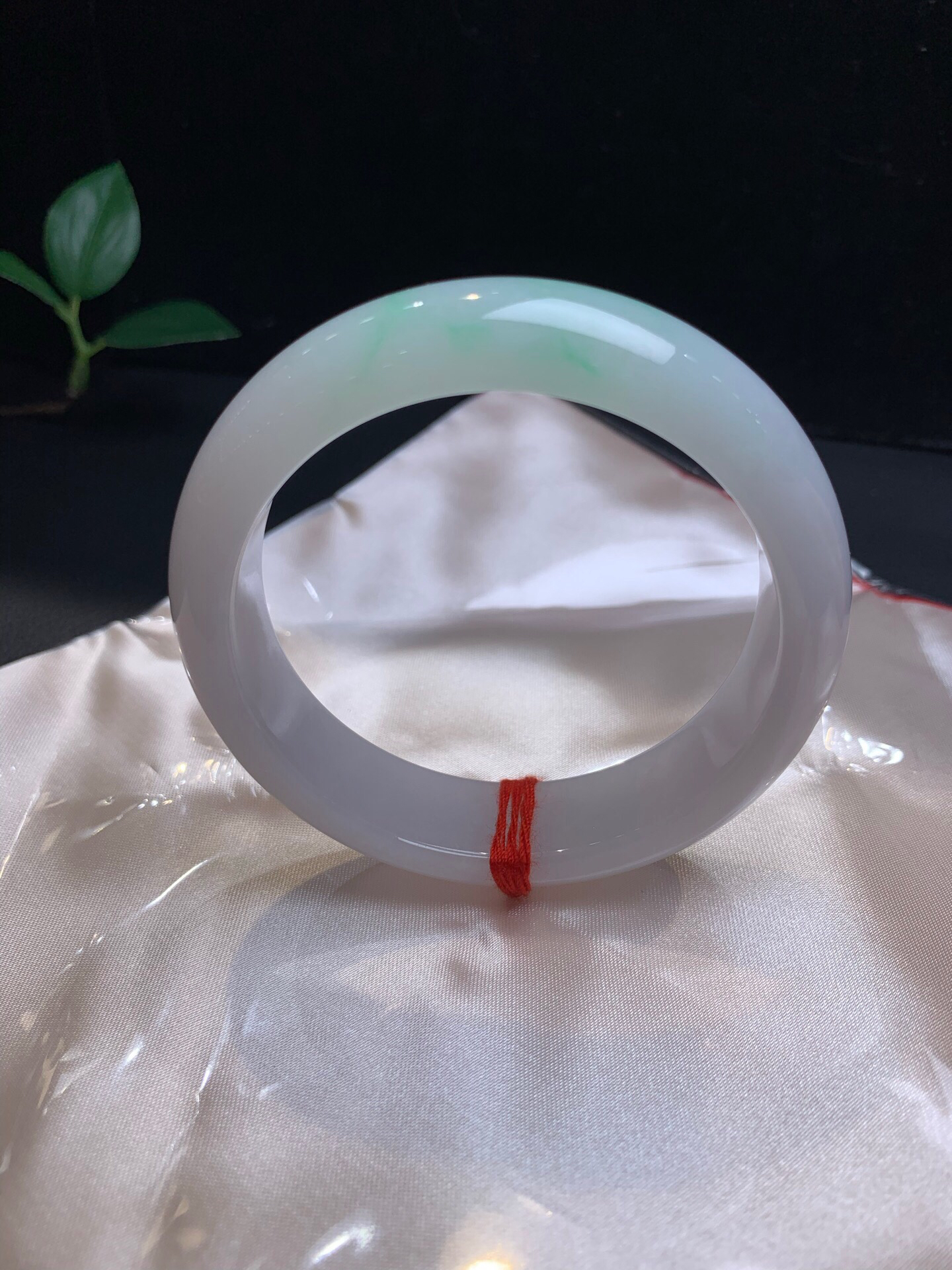 612695,57.5 飘绿正圈手镯,14.5-8.3mm,室内有点紫底的感觉,室外基本就是白底色,一截清新淡雅的绿底、干净完美,超值价💰28400 #优石客珠宝#香玉荟萃